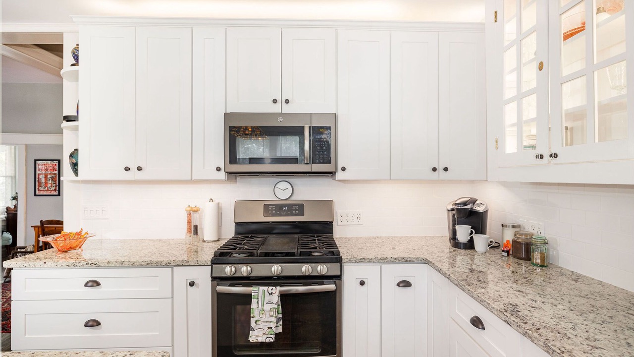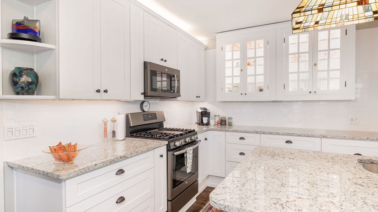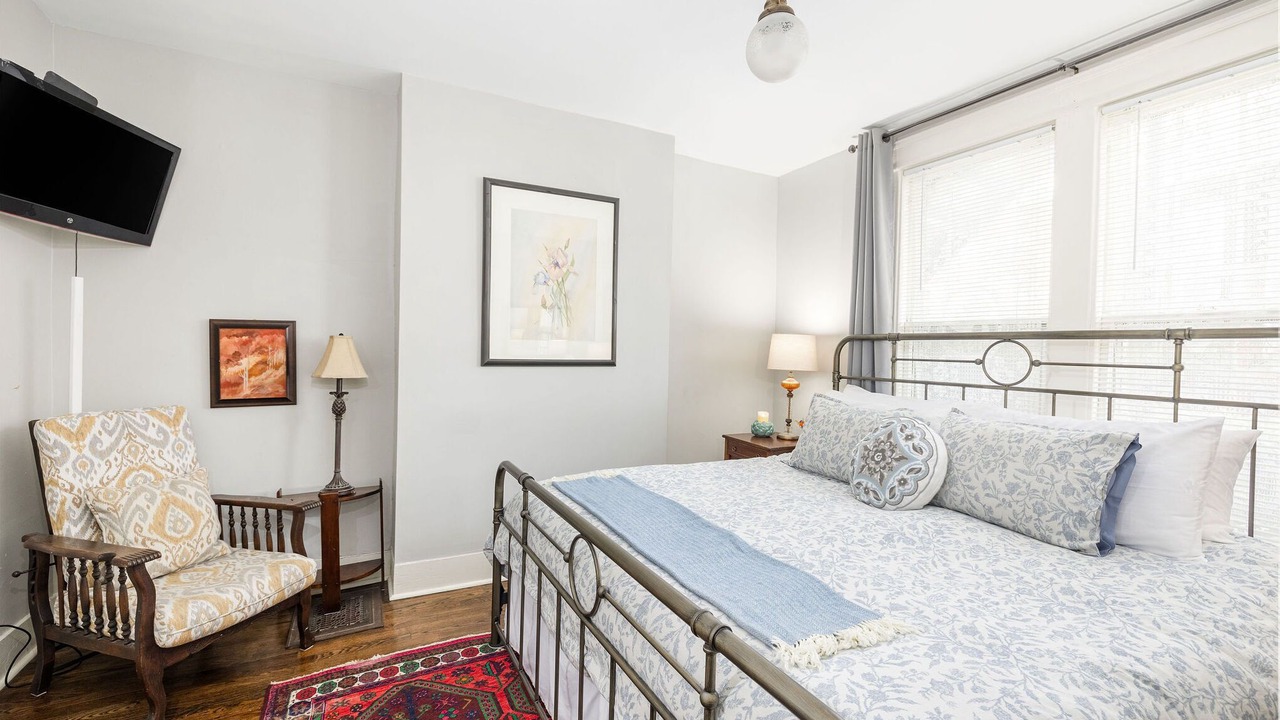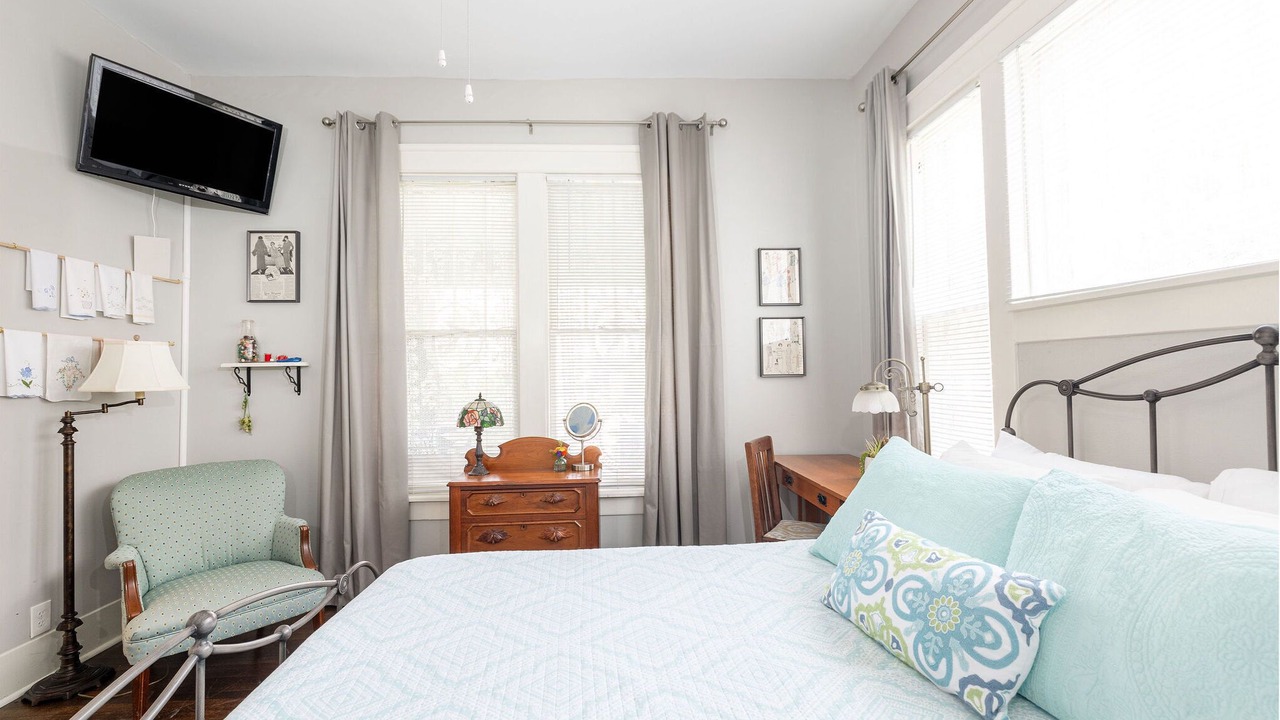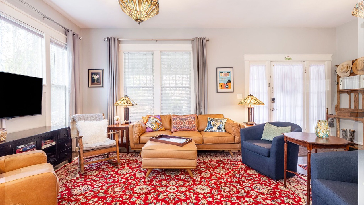 Amenities include free WiFi, 4 Smart TVs w/ local channels, Roku, Amazon Prime & Netflix. 12-cup & Keurig coffee makers, tea kettle, most small kitchen appliances, outdoor gas grill for eating at home. Cutlery & dish ware for 8 plus supplies for cooking/baking. High ceilings, dark stained wood floors and original tall windows maintain the historic feel.