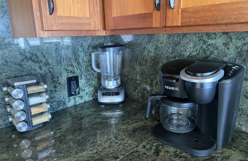 The heart of this home is its chef-inspired kitchen, perfect for preparing delicious meals and hosting memorable gatherings. The spacious granite-topped island not only provides extra prep space but also offers seating for guests to enjoy the chef's creations. The custom cabinetry, crafted from reclaimed yacht cradles, adds a distinctive nautical charm. With features like a pot filler above the cooktop for seafood feasts and a farmhouse sink for easy cleanup, this kitchen is as functional as it is beautiful. Fully stocked with all the essentials, you'll have everything you need to enjoy your stay.
