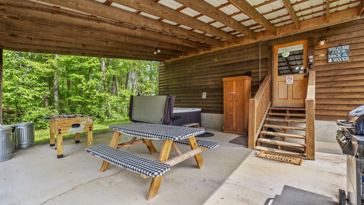 ✔ Patio (Hot Tub, BBQ, Dining, Foosball)