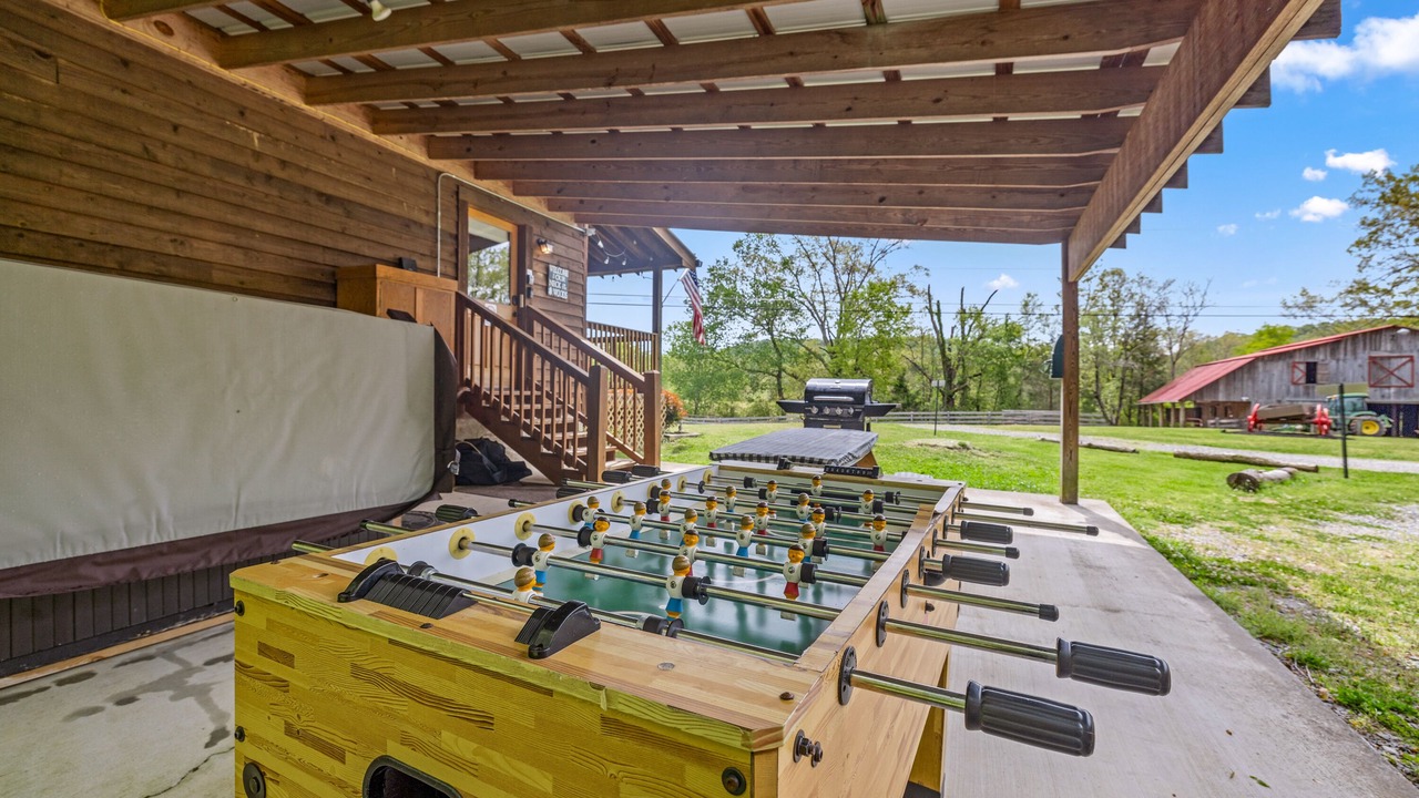 Come to the covered patio and hop in the luxury hot tub while the rest of the family plays foosball and prepares delicious BBQ.
