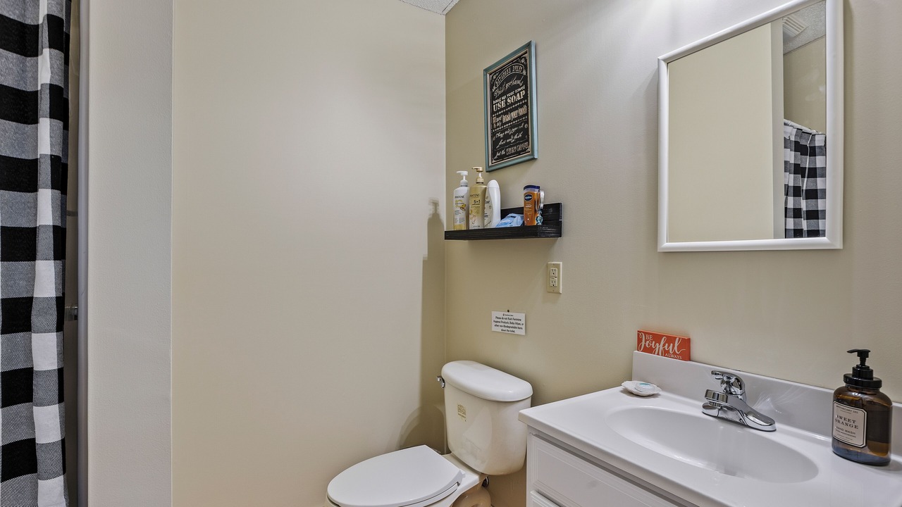 Besides the ensuite bathroom of the loft bedroom, the cabin features another full bathroom on the main floor. Both are stocked with fresh, clean towels in all shapes and sizes to provide a carefree stay.
