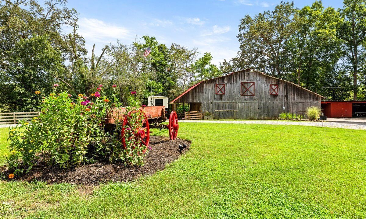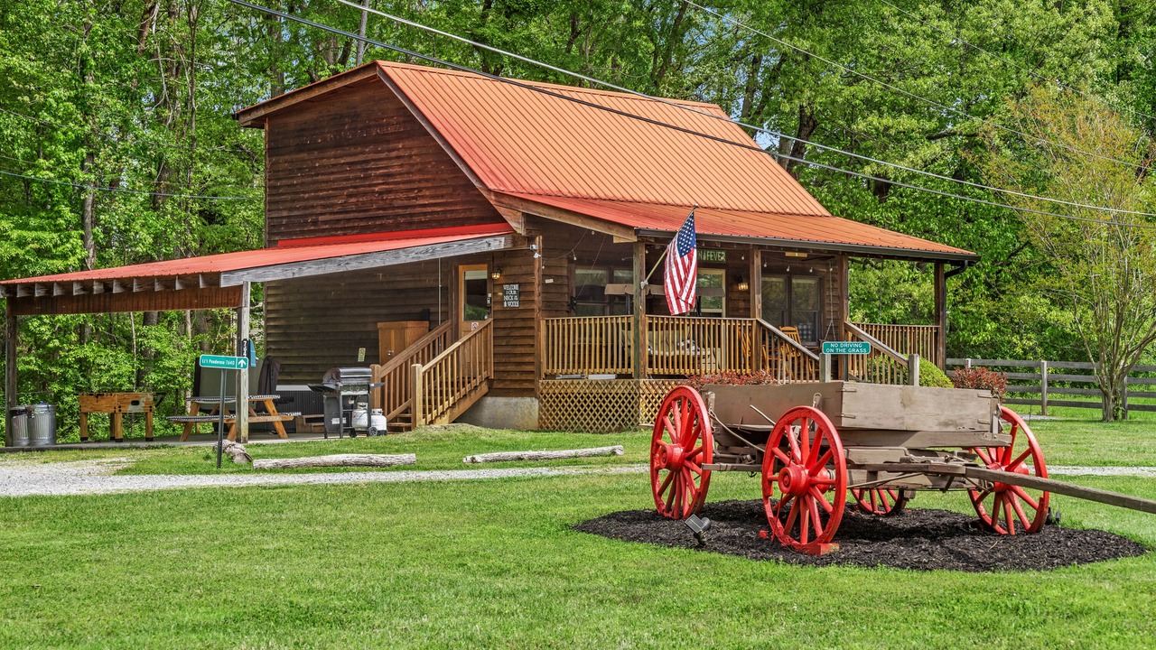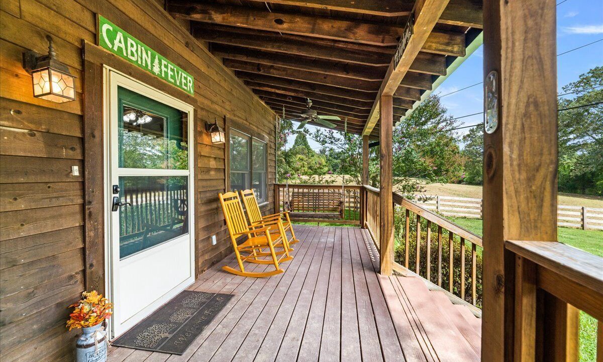 You won't have to leave the property whenever you want to enjoy the great outdoors. The cabin offers a "Southern porch", a private oasis perfect for outdoor relaxation, breathtaking views overlooking the hay field, an antique wagon, and a rustic barn.
