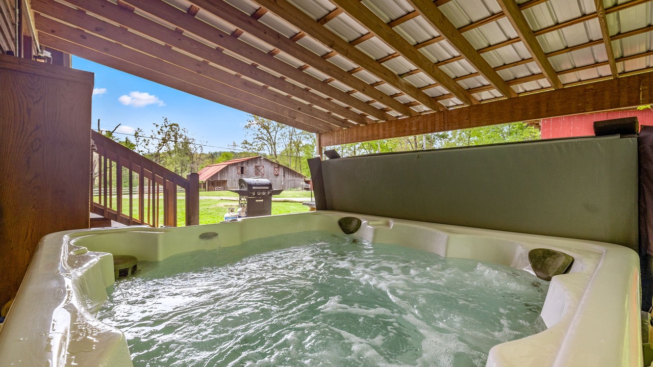 The covered patio with the luxury hot tub provides another lovely outdoor area where you can lounge the day away and marvel at the scenic surroundings with tasty treats sizzling on the BBQ grill.