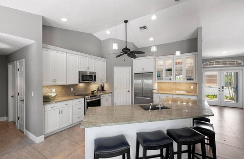 You may never want to leave the sanctuary of this professionally designed residence. It features a gleaming, white kitchen with granite countertops and stainless steel appliances. Open concept floor plan with dining area, kitchen island, media area and living room. The Primary Bedroom has a King bed with plush mattress, attached bath and direct access to the lanai. Master bath has double vanity, separate shower and luxurious soaking tub. The guest bedrooms, queen and twin, provide privacy on the opposite side of the house and share a bath with stone mosaic floor. Open the triple glass sliders from the living room and walk into your paradise; the screened lanai with heated pool, lounge chairs and covered dining area. Separate outdoor patio with grilling and seating. Free high speed wireless internet and three new flat screened TVs. There is nothing better than the warm southwest sun while lounging poolside. Please read our reviews for feedback from our guests.