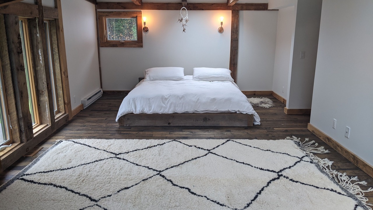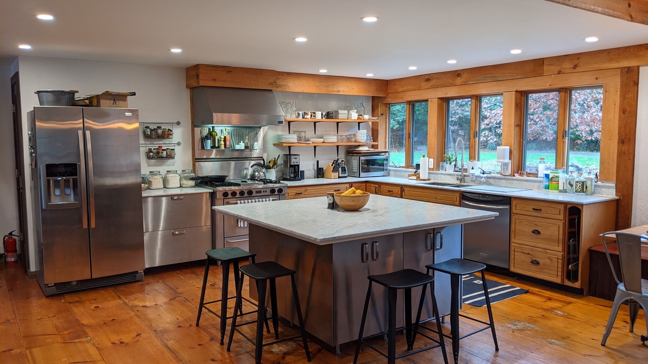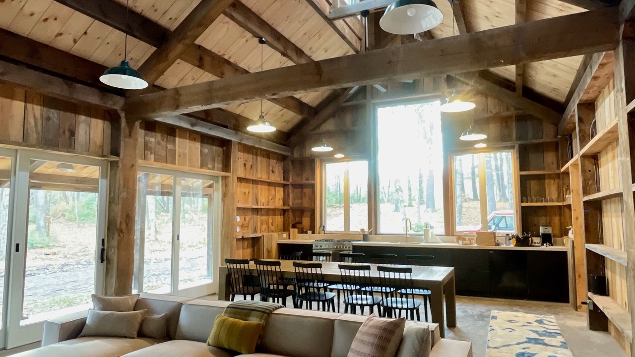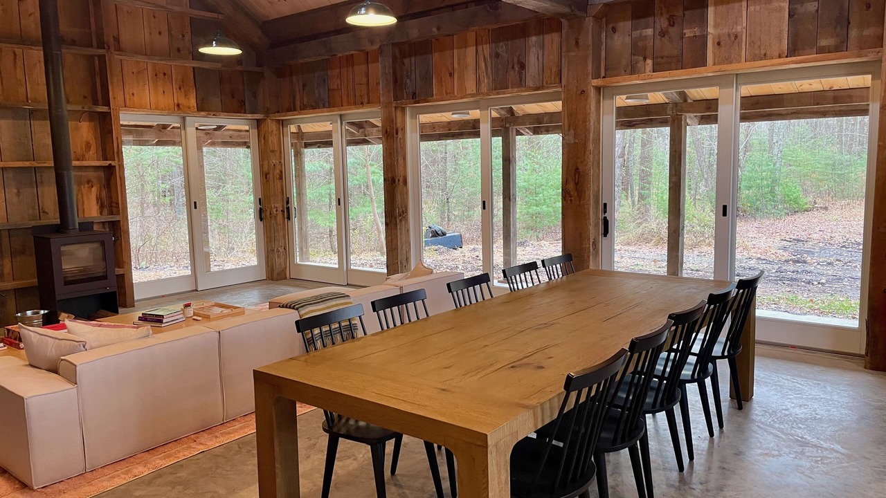 The guest house is a fully renovated barn where the family used to make maple syrup. The "sugar shack" as it's known, has two bedrooms and one bathroom with walk-in shower. The primary bedroom has a queen bed and a large walk-in closet with room for a pack-n-play (included). The second bedroom has a queen bed with a twin trundle below. The main room has 30-foot vaulted ceilings with a wood-burning fireplace, radiant heat floors, a dining table for 10, and a modern open kitchen.