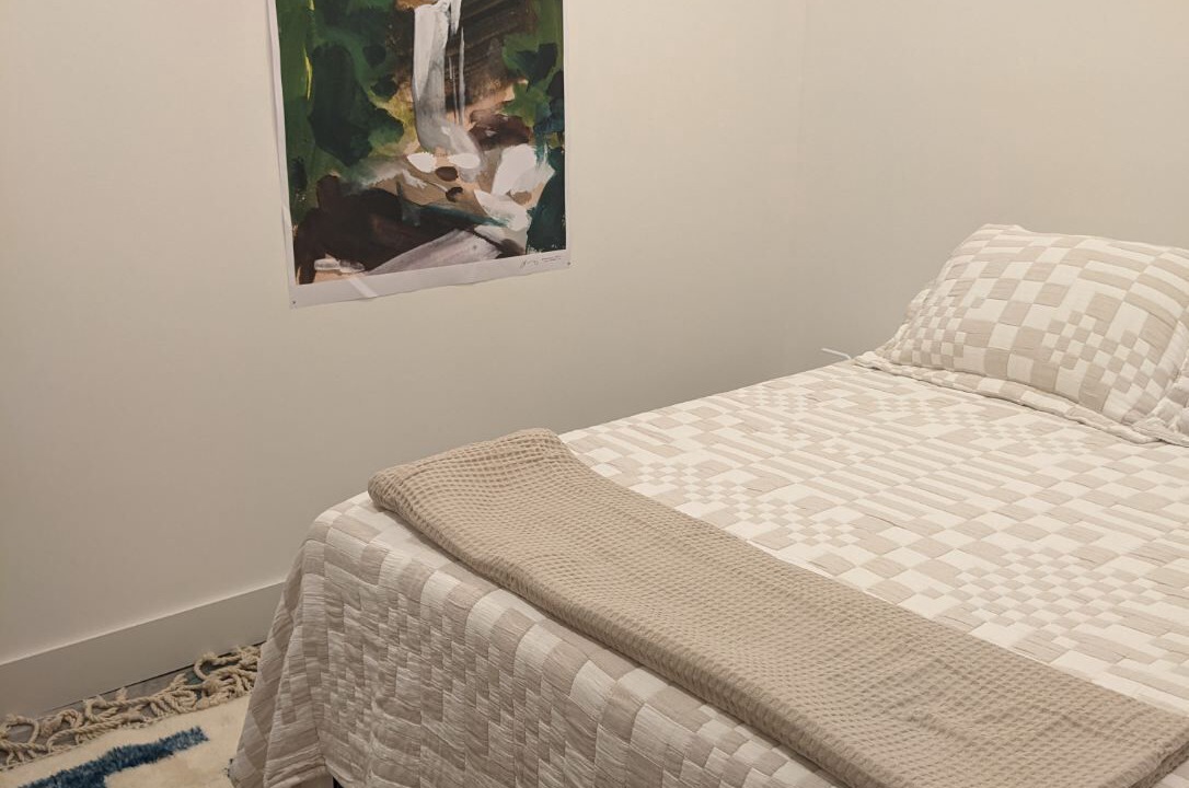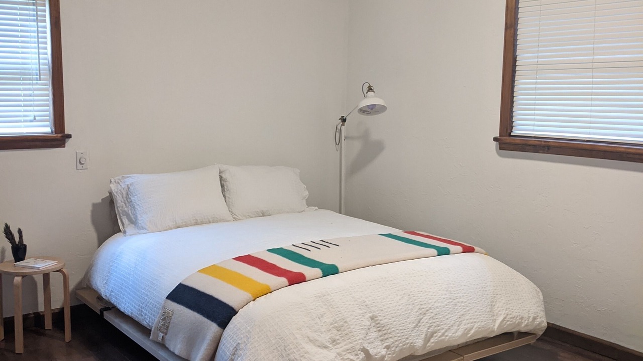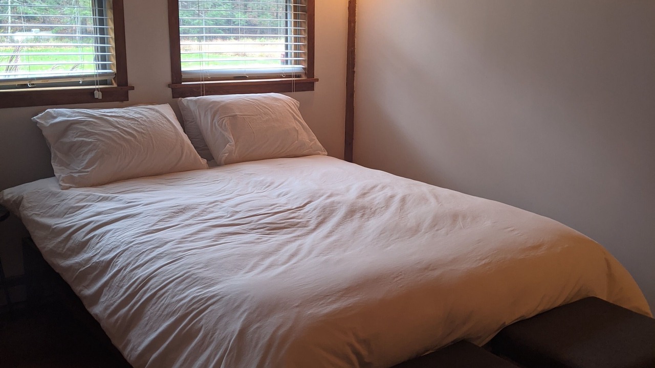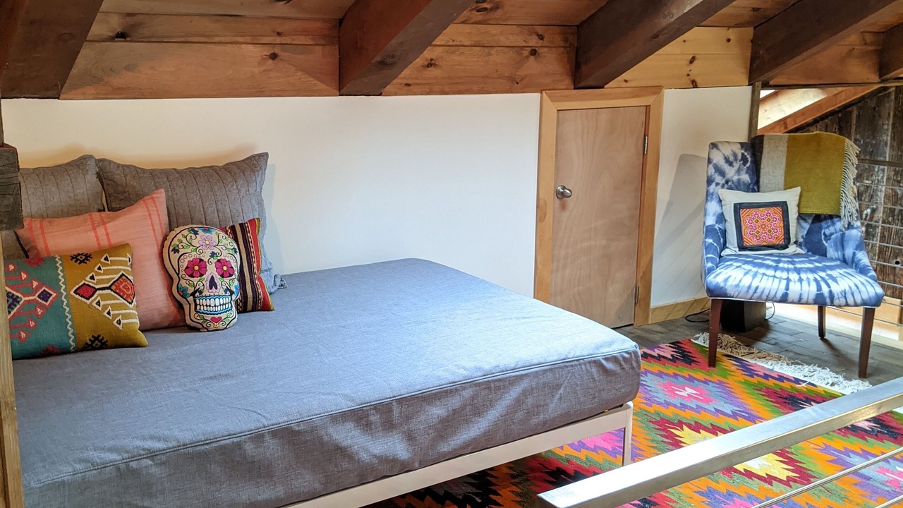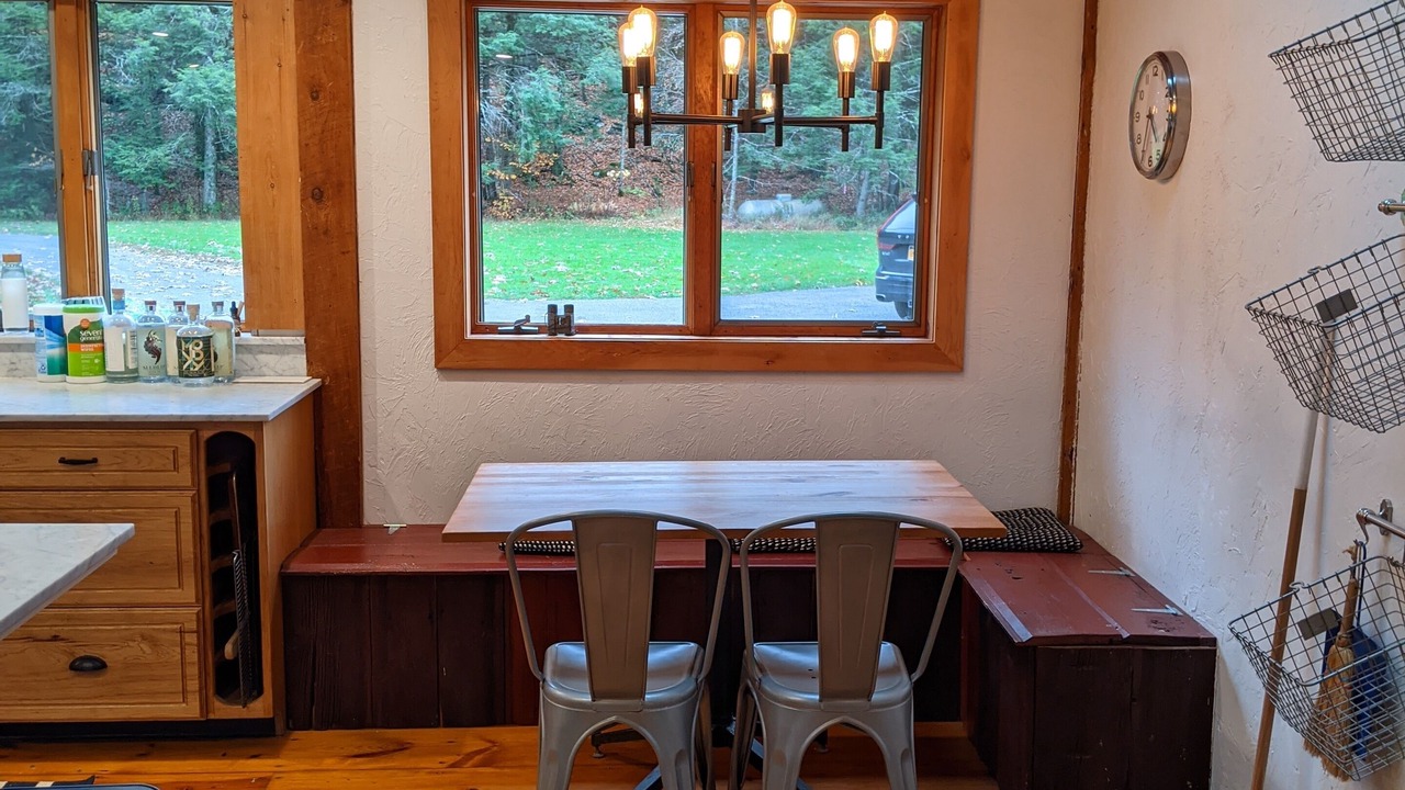 The guest house is a fully renovated barn where the family used to make maple syrup. The "sugar shack" as it's known, has two bedrooms and one bathroom with walk-in shower. The primary bedroom has a queen bed and a large walk-in closet with room for a pack-n-play (included). The second bedroom has a queen bed with a twin trundle below. The main room has 30-foot vaulted ceilings with a wood-burning fireplace, radiant heat floors, a dining table for 10, and a modern open kitchen.