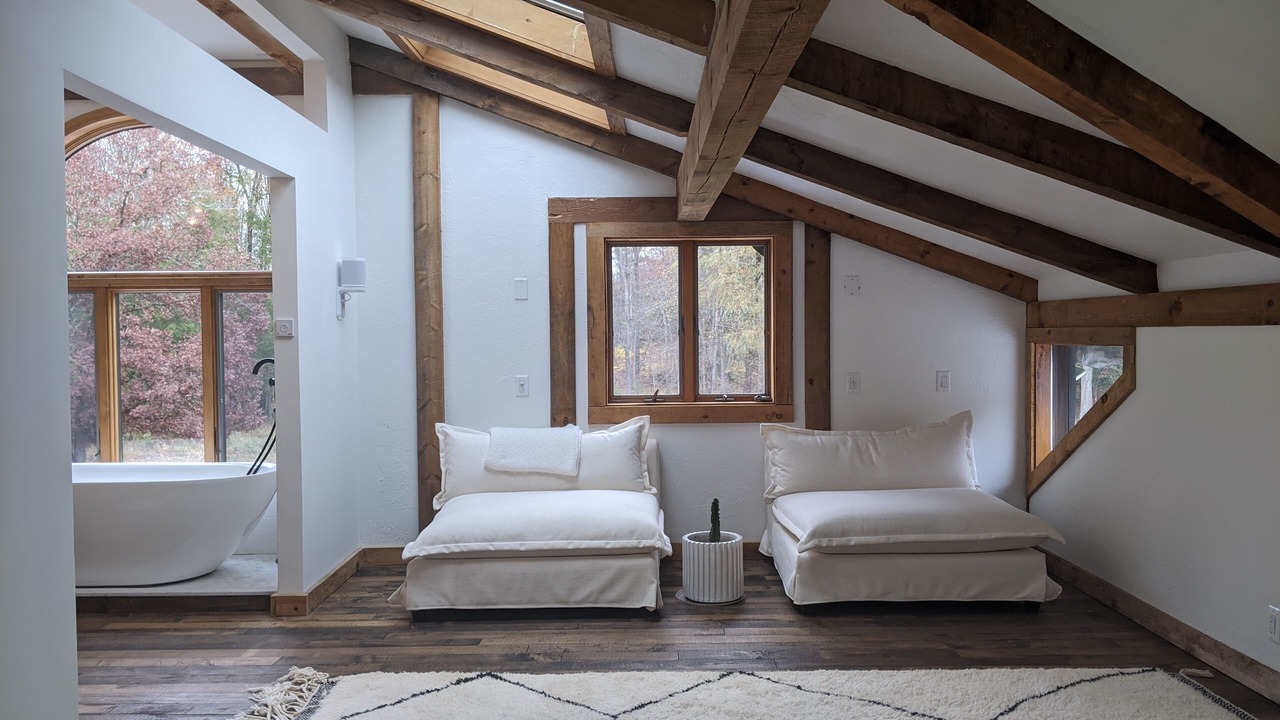 Upstairs you will find the loft and master bedroom. The loft includes a daybed and office desk. At the end of the day escape to the oversized master suite with its handmade wooden king bed, sitting area, dual vanity sinks, double shower, and freestanding tub with panoramic views of nature.