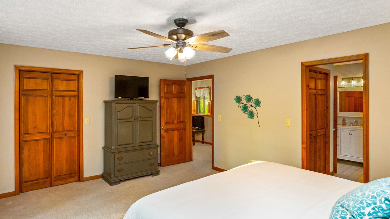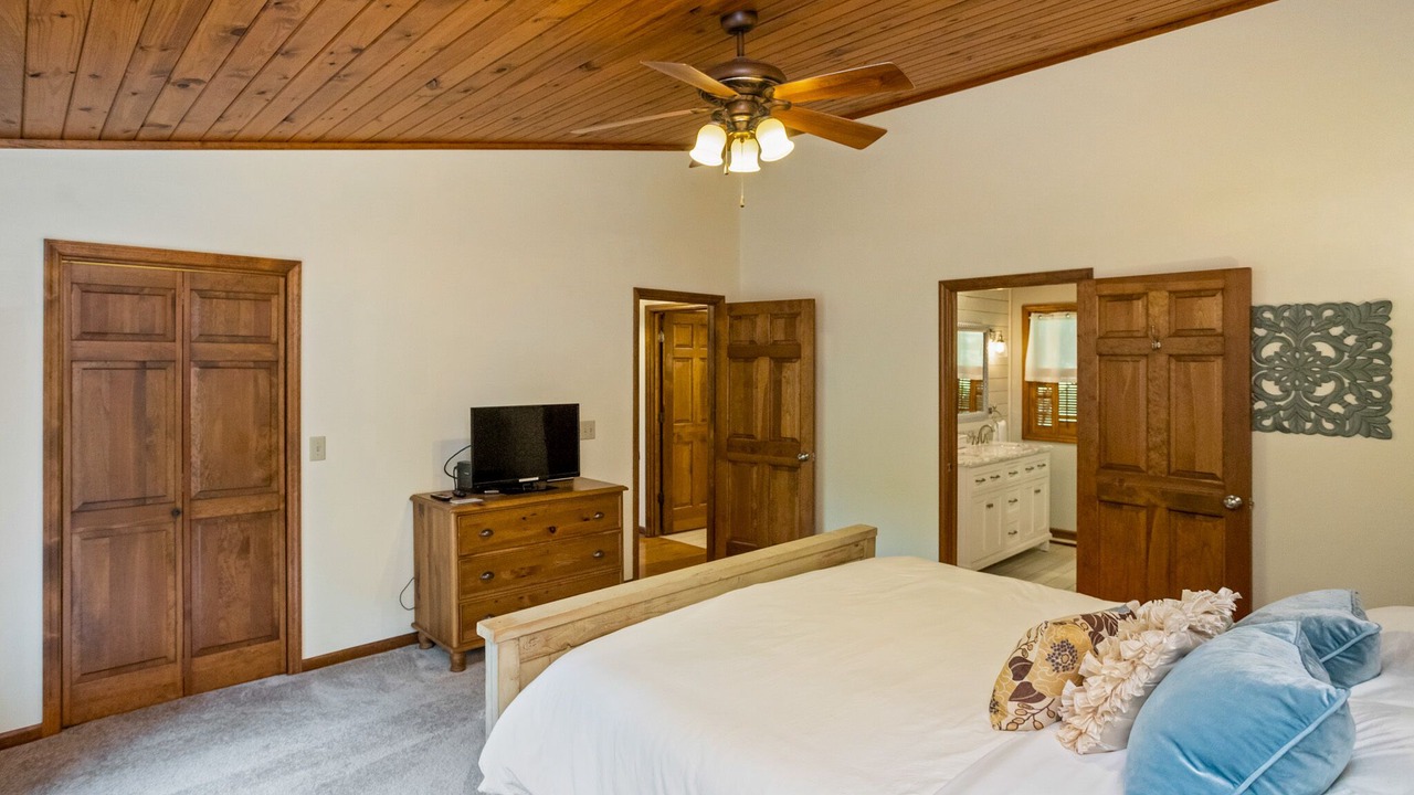 The home has 5 bedrooms: 2 Master Suites, one with a king bed, walk-in shower and one with a king bed and shower/tub combo. Another king size and a queen size room. There is a large room with a set of bunk beds and two twin beds. There is a connecting 1/2 bath. If you have additional guests there is a loft area with a queen size pull out sofa bed.