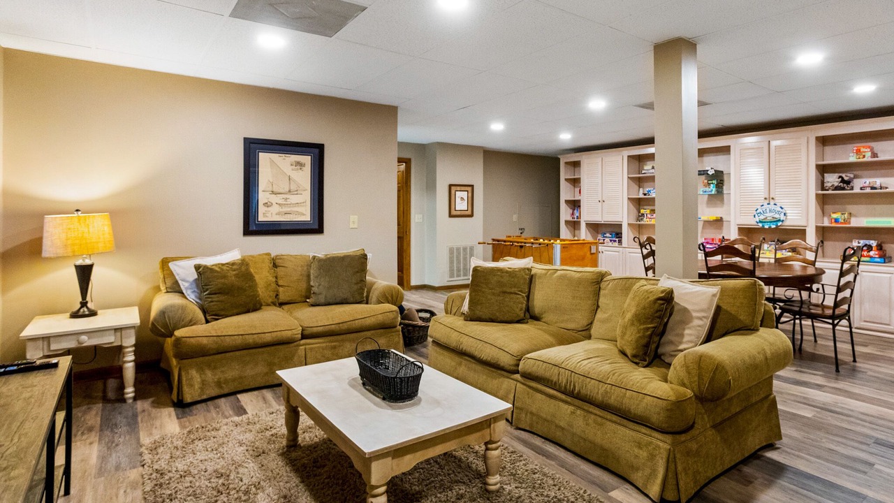 Sit back and relax in the living room while looking through a wall of windows overlooking the lake. For those cold evenings enjoy a fire in the stone gas fireplace. The children can relax in their own space downstairs while the adults are upstairs. Complete with a foosball table, 55" flat screen TV and game table the downstairs is set up to entertain! There is also a ping pong table and dart board for those late night tournaments . The house has has 6 flat screen TVs, Wifi, and Netflix and YouTube TV for your enjoyment, no satellite/cable. There is a cover deck area with large hot tub, party lights and bistro set for additional entertainment. There is a fire pit overlooking the lake, please bring your own firewood.