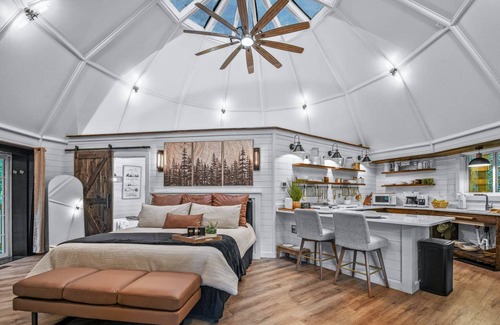 Drift off to sleep under a breathtaking domed ceiling with a skylight that lets the stars shine in. The plush king-sized bed is the centerpiece of the space — dressed in soft, neutral linens and layered pillows for maximum comfort. Positioned perfectly in front of the fireplace and large flat-screen TV, it's a cozy spot for late-night movies or slow mornings with coffee in bed. Flanked by warm wood accents and soft, industrial-style wall sconces, the bed area feels like a cozy cabin retreat with a modern edge. Above the headboard, a striking forest-inspired art piece adds a touch of rustic elegance and ties in beautifully with the natural surroundings seen through the wraparound windows. Whether you're snuggling up after a mountain hike or enjoying a lazy afternoon nap, this bed offers the perfect mix of comfort, style, and scenic beauty.