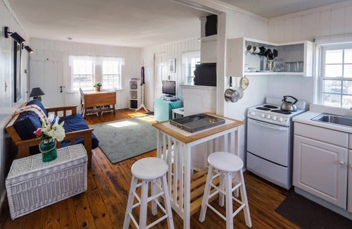 Classic Cape Cod charm awaits you in this sweet cottage on the water. Located directly across the street from Cape Cod Bay, its view will leave you breathless. Watch the boats sail by while enjoying your morning coffee in the living room, grill on the patio at night while taking in a magnificent sunset or take a short stroll down the street to enjoy some of Wellfleet’s most celebrated restaurants: The Pearl, The Bookstore Café, Ceraldi and Mac’s Shack. Venture just a bit further down the road and you’ll be in the center of downtown Wellfleet enjoying gallery walks and square-dancing nights on the Harbor. Outfitted with everything you need to enjoy your stay, and comfortable for up to five people. Please note as the second bedroom is a twin over full bunk bed, this room is most comfortable for children.