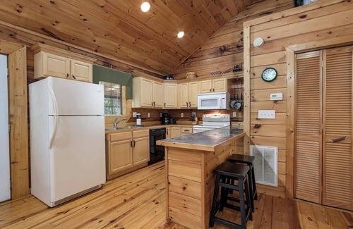 Tucked away in a wooded cove, this private studio Cabin has all the decor you would expect from us. It is near the other studios, so bring a group! Hot tub and beautiful stone electric fireplace, 65" Smart TV with Fast Wi-Fi, full kitchen, washer and dryer, foldout queen sofa, bathroom, and lovely appointments on the porch. Slip under the covers of the huge King size bed and sleep in as long as you want. Even if you are not a fisherman, you will love this for a getaway. Pets are welcome.