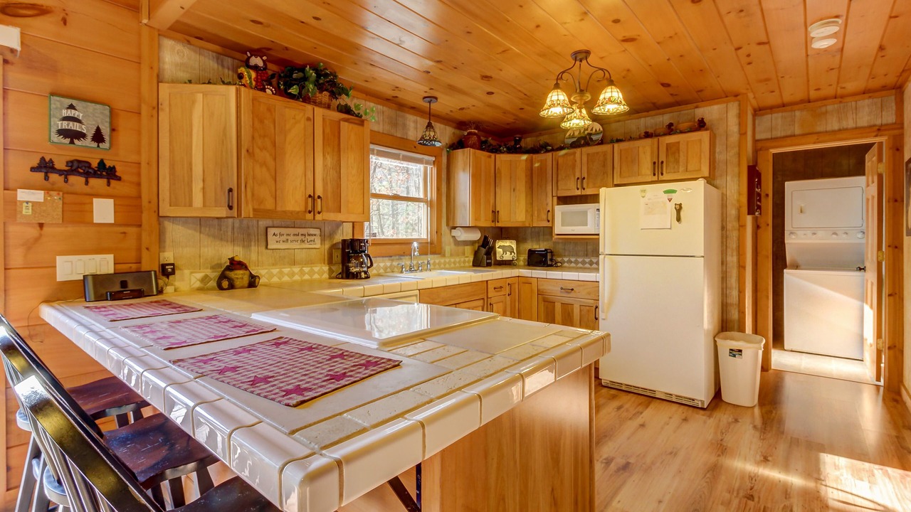 The kitchen has everything you need to make hearty meals: standard appliances - including a dishwasher - and plenty of counter and storage space. Dine together at the table for six, and use the breakfast bar for three for additional seating. Or have a cookout, thanks to the charcoal grill, and enjoy your meal on the spacious deck. When bellies are full and the dishes are done, relax on the porch swing with your favorite after-dinner beverage.