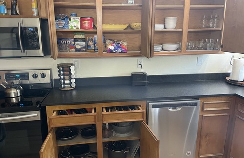 Fully Furnished Cedar Cabin resting on stilts among the trees with a huge front deck with patio furniture and a BBQ Grill. The back porch has furniture and overlooking the woods with hammock and creek. There is a Campfire Ring and Firewood provided for your roasting marshmallows and campfire enjoyment. A short hike about 1000 feet back to Lake Lewisville through the trails in the woods and a short walk or drive to West Lake Park. 1 mile to boat launch. 3 Bedroom 2 Bathrooms just remodeled rustic decor. Full kitchen with all the needed cooking supplies and spices and some sauces. Lot’s of board games, puzzles, Corn Hole and washers. It can be a short term rental daily weekly or monthly rental. Property is over 1 acre in the Lake Dallas Hickory Creek area. 1 Queen Bed 1 Full Bed and 1 Twin Bed that can be converted to King. With 2 decks with seating on both. New Central AC/Heat, New Windows, New Water Heater, New Floors, New Paint. WiFi, New 55 inch Flat Screen for Streaming, Washer and Dryer. Includes water, sewer, trash, internet & electricity. This property is part of the Lake Dallas RV Park.