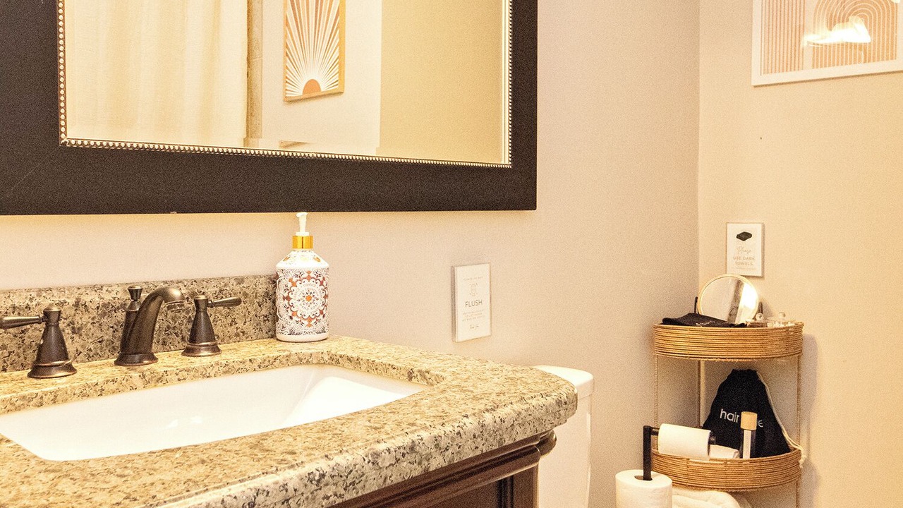 - Bathrooms: 3 full bathrooms stocked with fresh towels, toiletries, and essentials. Forgot something? Don’t worry, we have your essentials like Q-tips, disposable tooth brushes, makeup wipes and more.