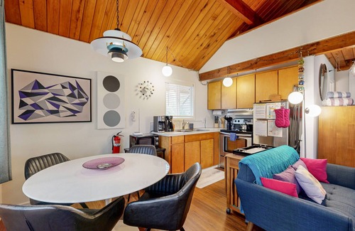 Inside, every necessity can be found in the open, lofty, studio-style layout. Enjoy a compact kitchen with stainless steel appliances, a dining room table for four, and a sitting area with mod furnishings and a TV with DVD, Blu-ray, and streaming capabilities. The comfortable bed is tucked into its own alcove, and the full bathroom offers a beautifully tiled walk-in shower.