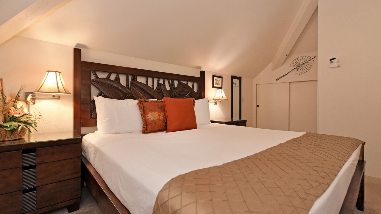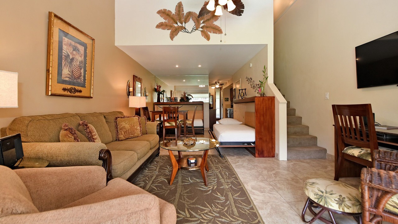 Remodeled in North Kaanapali. This resort view second floor loft style condo has stairs to its entrance, no elevators. The king size bed is in the loft bedroom. In addition to the large flat screen TV in the living room there is also a TV in the loft bedroom. The 2 twin 'side tilts' downstairs in living area are perfect for the kids. Bring your laptop and enjoy free wireless internet access from anywhere in the condo. This rare 1 Bedroom 2 Bath unit is well equipped with full kitchen with granite counter tops and spacious lanai patio for enjoying the warm evenings.