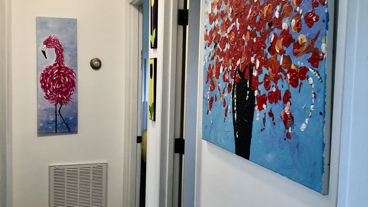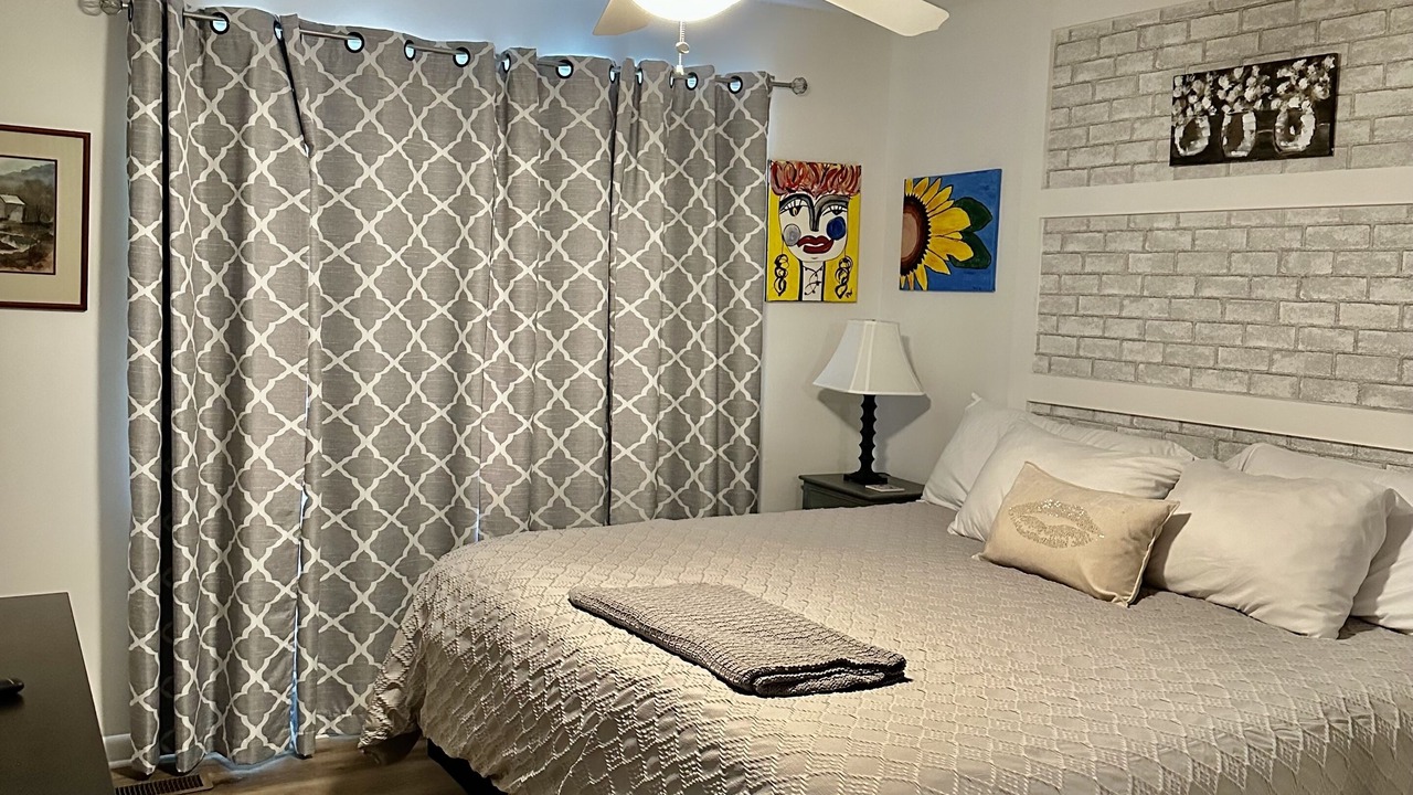 Remodeled one level duplex conveniently located. Walk to Dunkin Donuts for your morning coffee or use the Keurig provided. Located on the Medtech Pkwy walking trail which spans 3.5 miles. Close to literally everything! ETSU, Milligan College, Johnson City Medical Center/Mountain States, Franklin Woods Hospital, Bristol Motor Speedway, Jonesborough, Winged Deer Park and many more attractions are close by. A fully equipped kitchen, bedroom 1 has a king bed and television and bedroom 2 has a queen bed, back deck for relaxing, and fiber optics. LOVE ART? This unit is full of original art that is available for purchase.