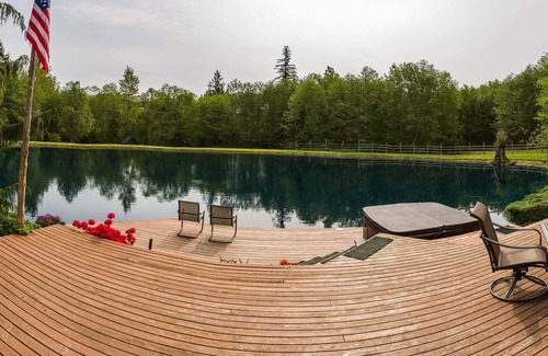 The grounds are well landscaped and include a turquoise half-acre pond. The pond is strictly available for our VRBO guests; we only use it on those rare days when the cabin is not booked. We have horseshoes and corn hole for an evening of fun, or sit by the fire pit. You can enjoy a refreshing swim on a warm summer day or fishing when the temperatures cool down. We lose fish in the warmer summer months, so we ask our guests NOT to FISH in June, July, and August. If catching a lot of fish is important to you, we suggest you book elsewhere. We never know how many fish are in the pond due to predators, poor fishing techniques, and hot weather. We have purchased a stand up paddle board for guests to use during the warmer months. Finish the day with a relaxing soak in the hot tub.
