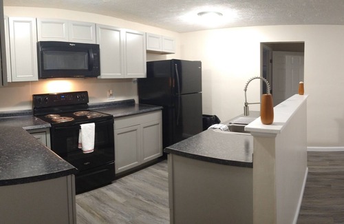 With one queen and one full bed, a full kitchen and comfy living area, with cabinets stocked with the basics, you'll be free to relax and enjoy your visit. The entire apartment is yours! The parking is a large shared lot. Your private 2 bedroom getaway awaits!
