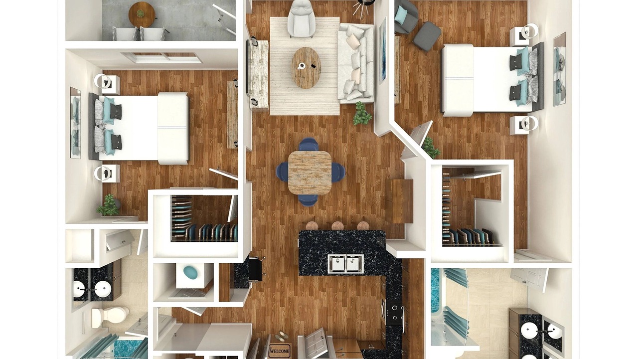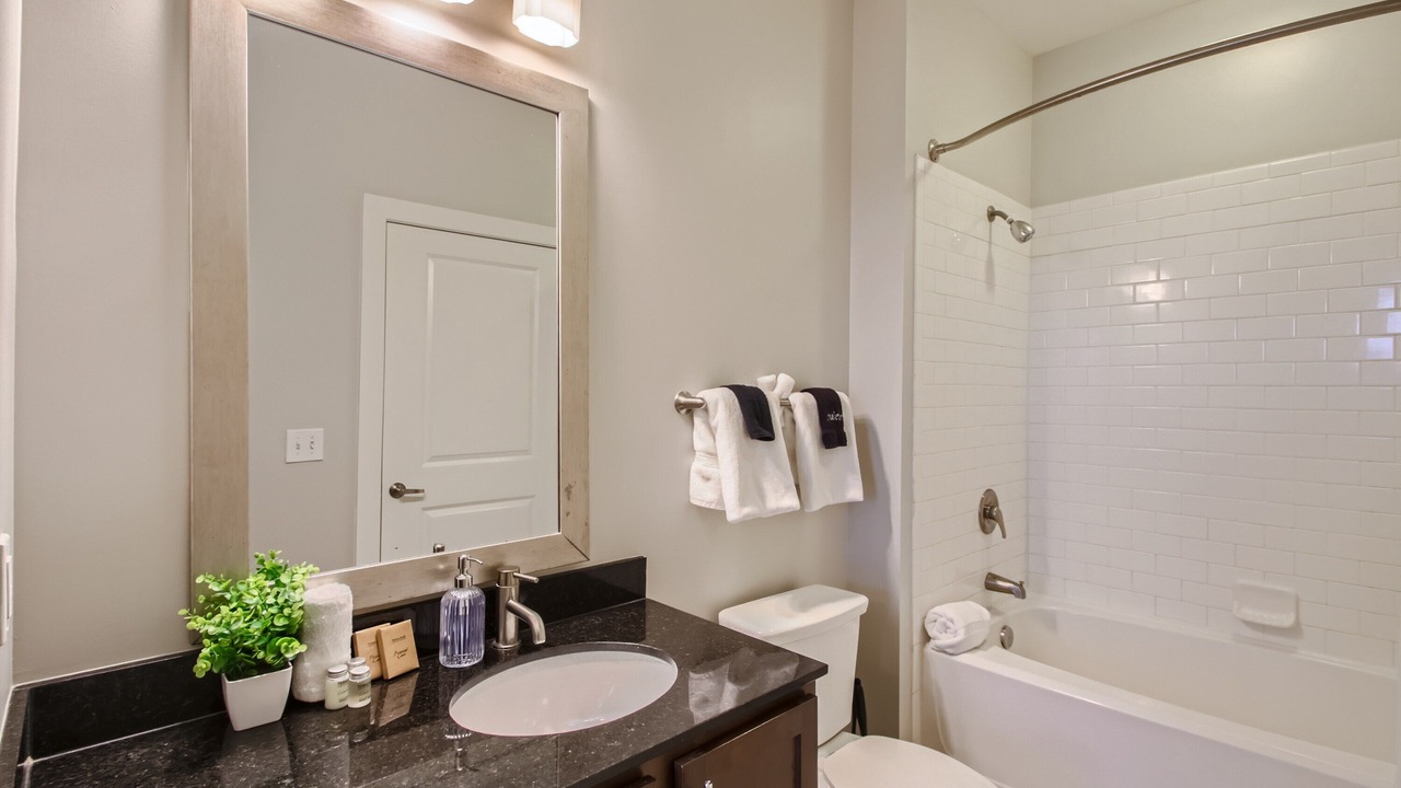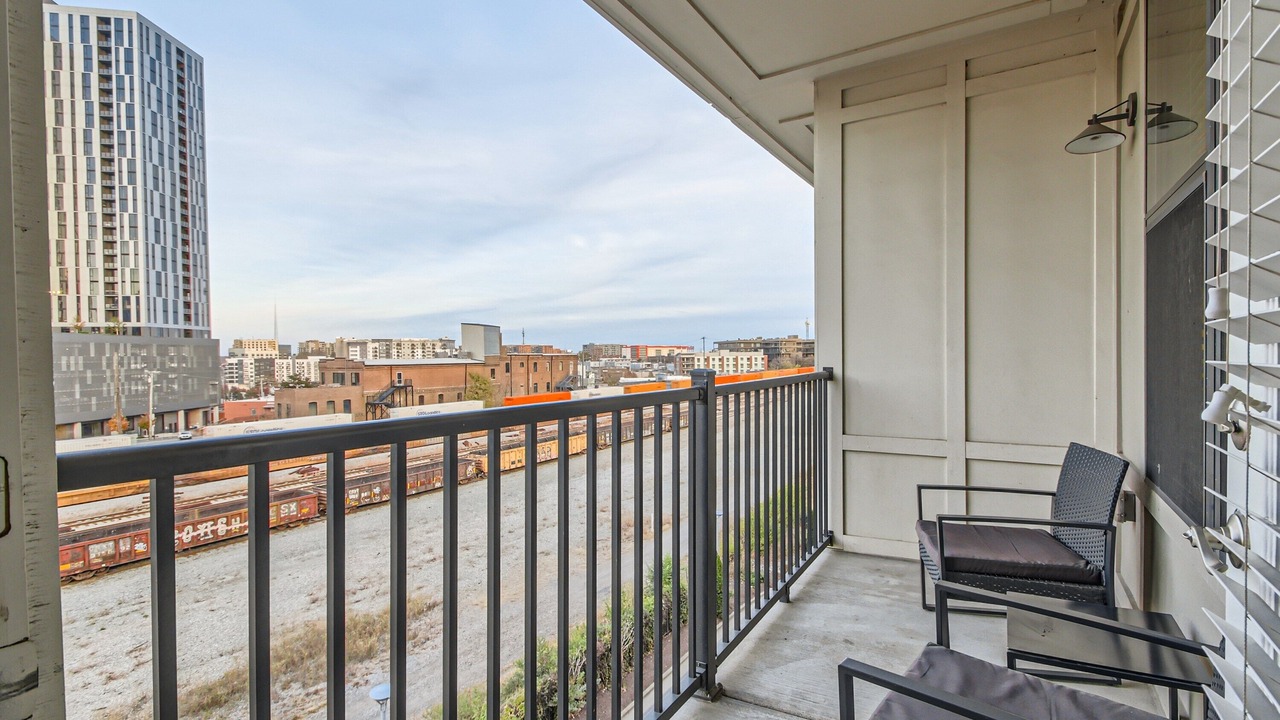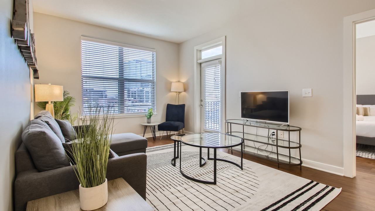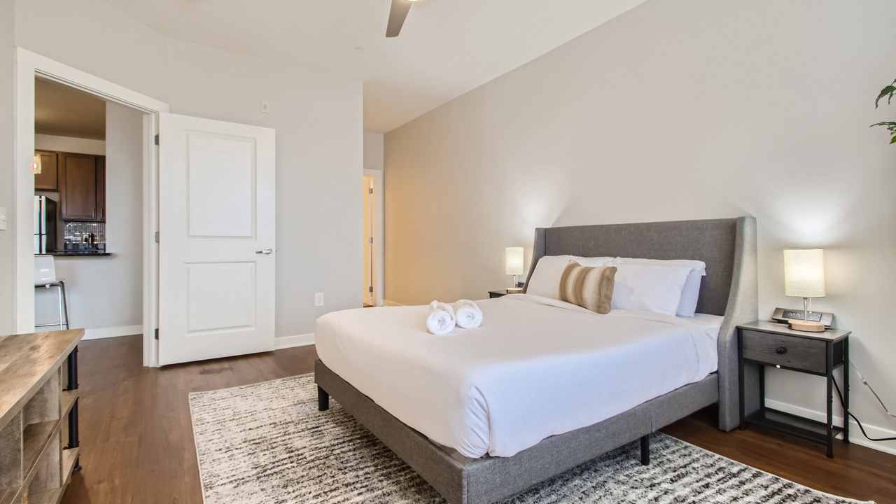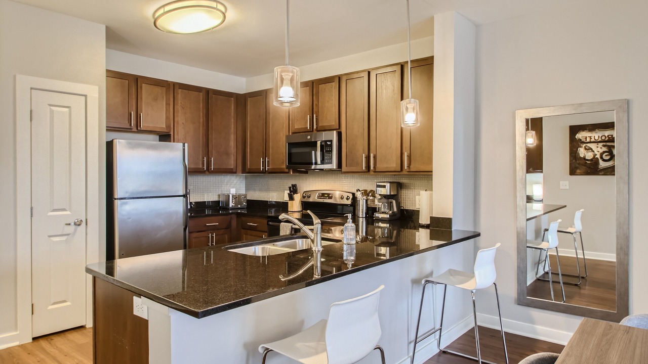 This apartment features an open-concept dining and living area with a private patio so you can relax from the bustling activity the Gulch offers! To the kitchen's right is a black granite desk, matching the island, if you need to handle some business while you stay with us. You'll love enjoying the patio in between emails!
