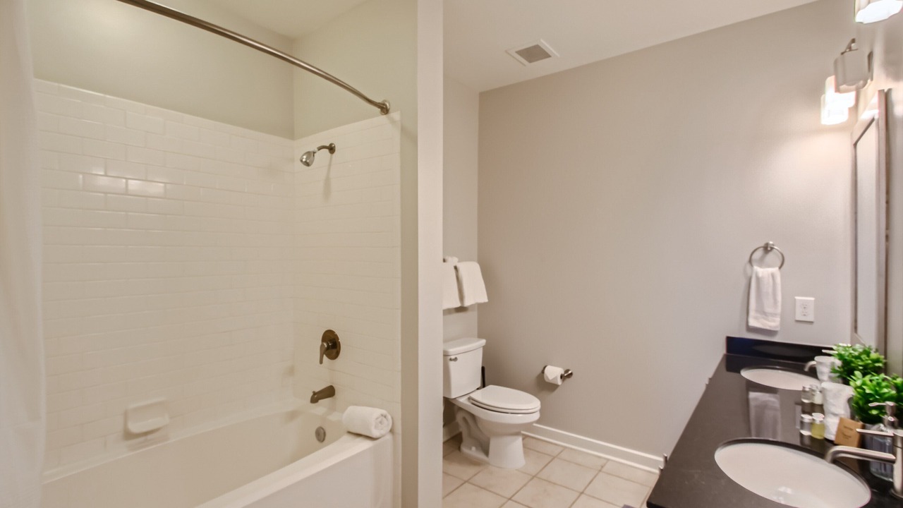 The Master bedroom with an ensuite bathroom is to the left of the open-concept living room, with a modern and bright feel and a large walk-in closet setup for your belongings. With ample space for 2, the bed is a plush foam queen with an extra blanket for comfort. Off of the bedroom is the large ensuite bathroom with bright double vanities and a sizable garden tub with a modern subway tile backsplash, big enough for a few people to get ready at the same time!