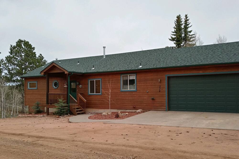 The main level of the home features an open floor plan with vaulted ceilings, a rock fireplace, and spacious kithen. You will find the master suite located on the main level, as well, with a beautiful en suite bath with a deep soaking tub. Three additional bedrooms and a family room are located on the lower level. There are multiple decks to choose from for the perfect morning coffee spot or late night star gazing. Elk Valley Retreat will make a perfect home base for your adventure to the Pikes Peak Region of Colorado!