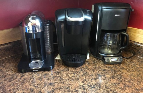 A FULL-SIZE REFRIGERATOR , MICROWAVE, STOVE/OVEN, DISHWASHER,TOASTER, KEURIG, NESPRESSO AND REGULAR COFFEE MAKERS, BASIC COOKING SPICES, PLUS POTS, PANS, PLATES, AND SILVERWARE.