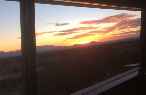 Situated on the edge of a mesa overlooking the high desert chapparal with 360 degree views through a 20' long window, running, biking, walking trail just out the door! Secluded, serene, yet only 12 minute drive to the Plaza and 5 minutes to 2 of the best eateries in the Santa Fe area. At the end of a paved road on 5 acres. All amenities, all new appliances in a gourmet kitchen. Beautifully designed bath with an invigorating shower. Pets are welcome with a fee for each pet per night.