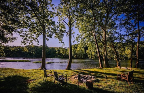 Escape to the New River Valley and enjoy the most beautiful time of the day and this charming cabin: Golden Hour. Golden Hour sits at the highest point of the property overlooking rolling meadows and mountains. Only a 2 minute drive down into the valley and you have access to 3000 feet of private river frontage (shared with two other small vacation homes), the New River Trail (55 mile scenic hiking/biking trail), and several spots for lounging with a fire pit next to the water. On the right side of the property, sit down by the river and throw a folding chair in the water as your watch the sunset. On the far left side, enjoy the deep still waters for swimming and fishing. Have a campfire when the sun goes down and if you're with us in the summer, enjoy the light show by the fireflies that light up the 5 acre private waterfront field. Drive to the river/trail access is only a 2 minute drive and if you're active and want a hike, its about a 12 minute walk down. The home itself is stylish and comfortable with modern amenities and a two person bubbler tub perfect for romantic evenings. Enjoy misty mornings with your cup of coffee from the screened in front porch.