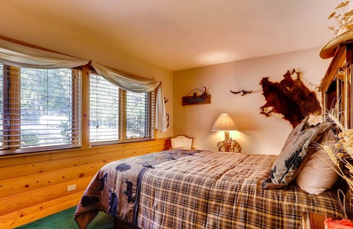 With the 4 bedrooms and the 5th sleeping loft all come with comfortable Queen beds and western/mountain decorating a good nights sleep after a day in the great outdoors is assured. The Master has an attached bathroom, with Jetted tub and sink with a long counter to put all of your bathroom needs. There is another full bath attached, that has a shower and toilet along with another sink and counter, with a door to the master and also to the hallway, so it can be used by others. On a separate wing, with the 2 bedrooms decorated in western decor, they have Queen beds, with a full-size bathroom to share. On the sleeping loft there is yet another Queen bed and plenty of space to hang out, or go sit outside on the deck through the double doors. Downstairs is a private bedroom, with new Log Queen bed and plenty of room in the closet for vacation clothes. The bathroom on this level holds the new steam shower/ toilet and double sink.