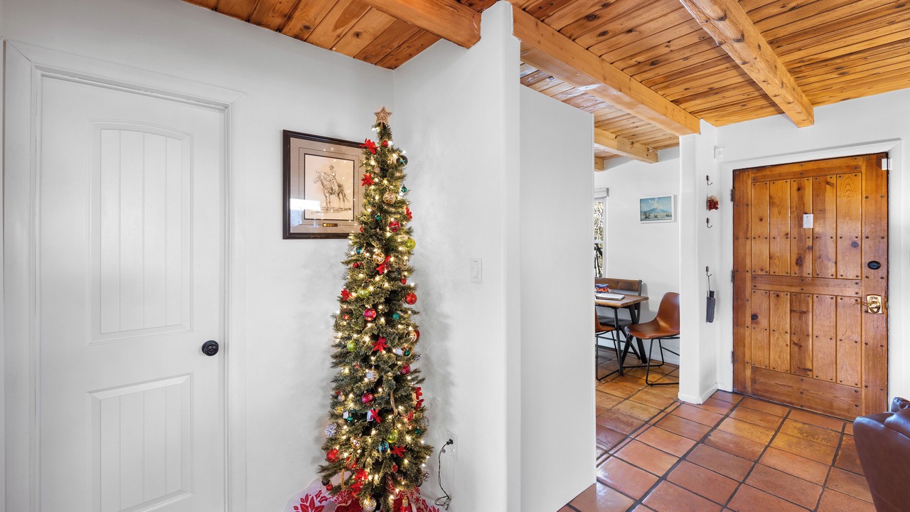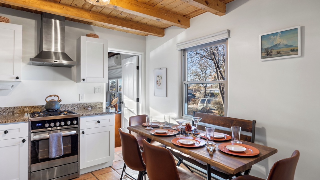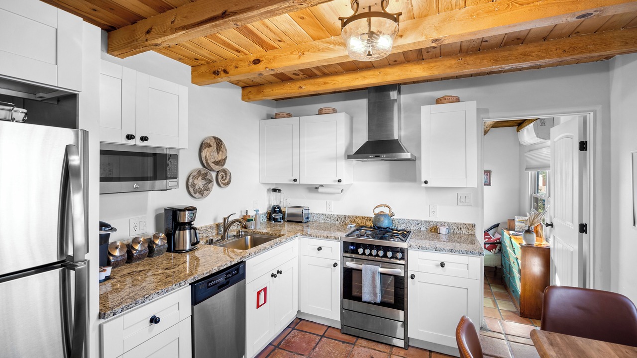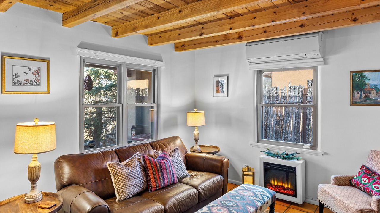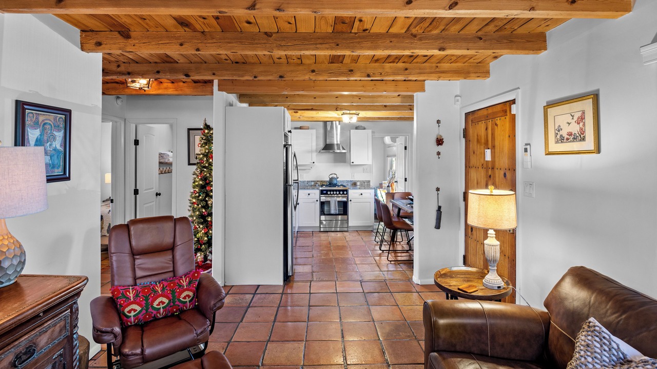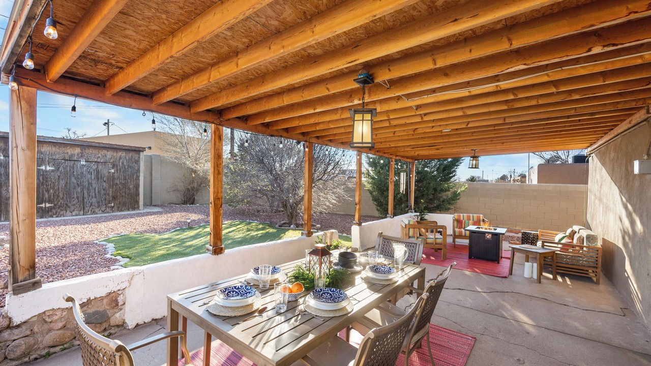 This charming renovation offers visitors a taste of mid-century Santa Fe. With customizable heating and air system, fully-stocked kitchen with stainless appliances and granite countertops, two bathrooms (one full bath, one 3/4 bath with walk-in shower) and outdoor living space with two seating areas, fire pit and landscaping, you can have it all. With the exception of some vintage, artisanal pieces, furnishings are new as are all linens.