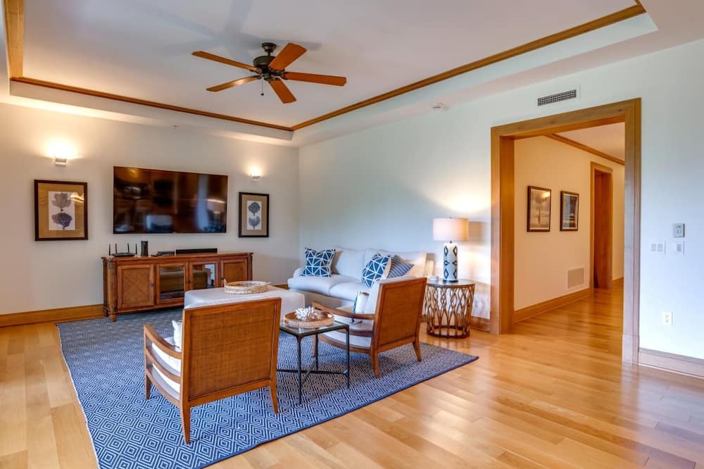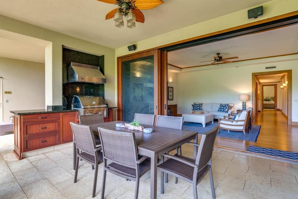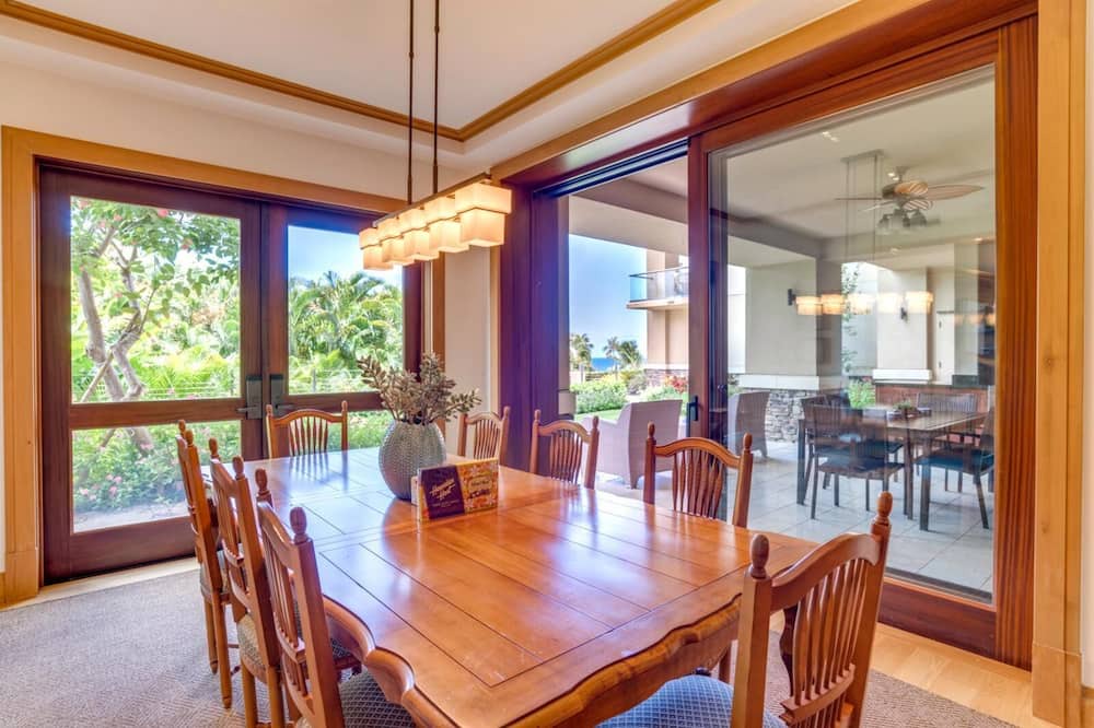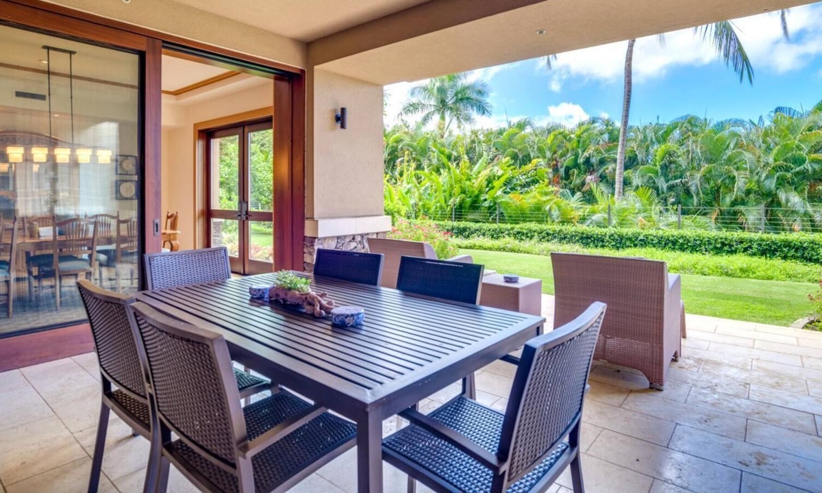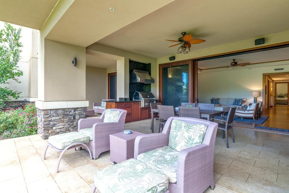 ** Please note, free night discounts are already included in the advertised rate and no additional deductions are necessary.** We invite you to the ultimate Maui vacation! Luxury awaits in this elegant villa with 3 bedrooms, 3.5 bathrooms with resort and partial ocean views. Every detail of this 2,900 sq. ft. retreat was carefully selected, and quality crafted creating the perfect vacation setting with you and your family in mind. Stepping into your private entry, you immediately notice the intricate details of modern sea accents, hardwood floors and trey ceilings. The open concept living area is greeted by an overflow of natural light streaming through the wall-to-wall Nano glass patio doors. The private, yet serene Lanai with its 1,200 sq. ft. of additional living space that opens out onto grass lawn and beach access down the stairs. This is the perfect place to dine and indulge in a fresh squeezed Island Mai Tai. With spacious seating for up to eight, enjoy the Hawaiian vegetation of Plumeria and Hibiscus landscaped throughout. The outdoor grill is the perfect set up to cook for the family. Breathe in the salty air and watch the blue waves roll in while relaxing after a long day on the beach boogie boarding and building sandcastles. The lush greens mixed with the awe-inspiring ocean, makes this Lanai the perfect retreat! The living room is an entertainer's delight, with a fully furnished living space, flat screen television, complimentary WIFI for streaming, HDMI ready, and the furniture layout that is perfect for conversations or the kids to play board games, with seating comfortably up to eight. This villa is kid friendly with an option of a Pac n' Play doubling as a crib, booster seating, plastic cups and beach toys! The custom Chef's kitchen has everything you need and more! Create your masterful meals on the stainless steel Viking range as well as all Viking appliances. Awaken your senses as you enjoy freshly squeezed juice, coffee and Eggs Benedict at the large granite breakfast bar. The gorgeous dining room complements the kitchen with a large dining table with seating up to 6 and access to the Lanai. The master suite is its' own oasis, with its' hand painted art pieces and modern Hawaiian Luxury decor. Naturally wake from a restful nights sleep with light trickling in on the luxurious king size bed. Enjoy your morning coffee on the separate yet private Lanai just steps from your room. Reflect and revitalize in the tub and granite shower with multiple shower heads. Treat yourself to the luxurious assortment of L'Occitane bath and body products, found in spas worldwide. The second guest bedroom is complete with bright garden paradise vegetation views, modern Hawaiian accents with bamboo artwork, lavender pressed sheets, king size bed, and flat screen television for your guests or family to enjoy. The third guest bedroom is similar to the second with its' own personal bathroom, paradise vegetation views, modern Hawaiian accents, and flat screen television. This room is equipped with two full beds making this suite a perfect set up for your kids! Hairdryer, facial mirror, and fresh towels available in each suite. Your family and guests will surely feel relaxed and at home! This remarkable property can sleep up to eight guests with an additional sleeper sofa in the den. Although we offer premium towel and maid services, this unit is equipped with a full size washer and dryer for any of your home away from home needs. Enjoy everything that the 'Malia' at The Montage of Kapalua Bay has to offer!