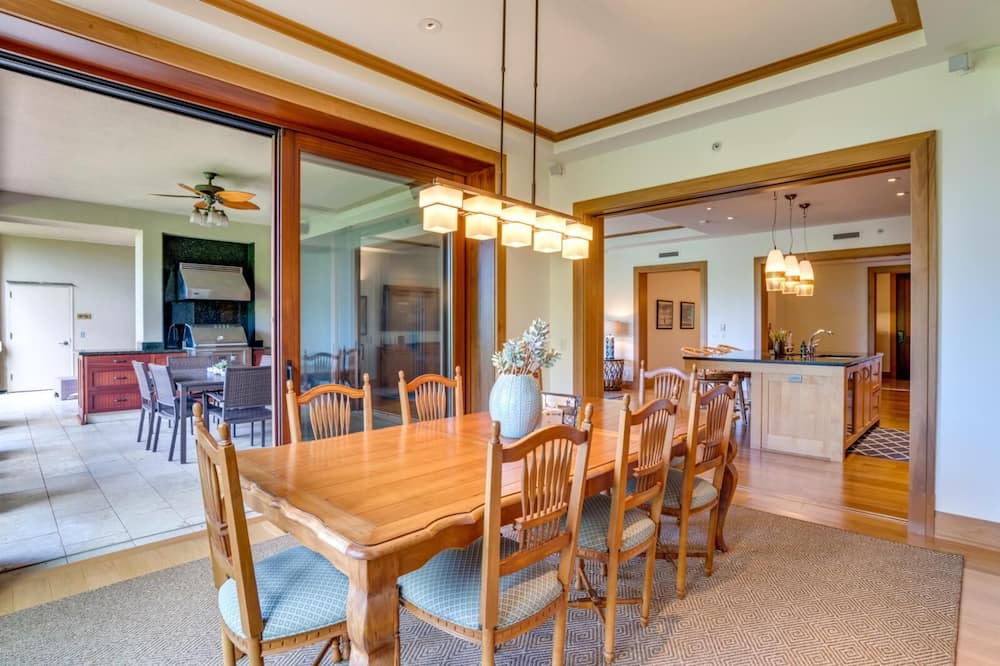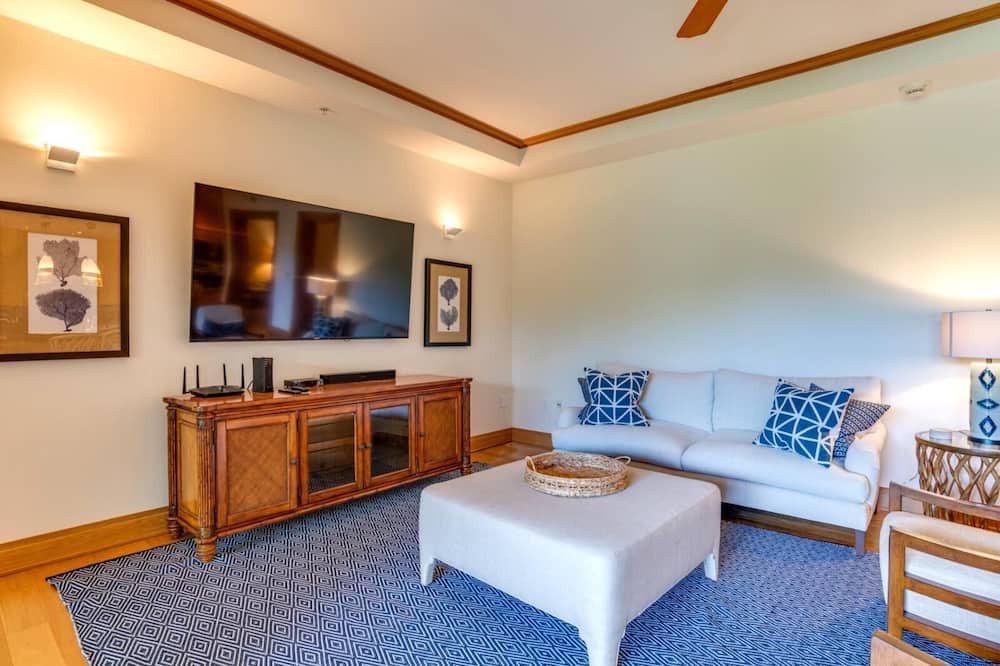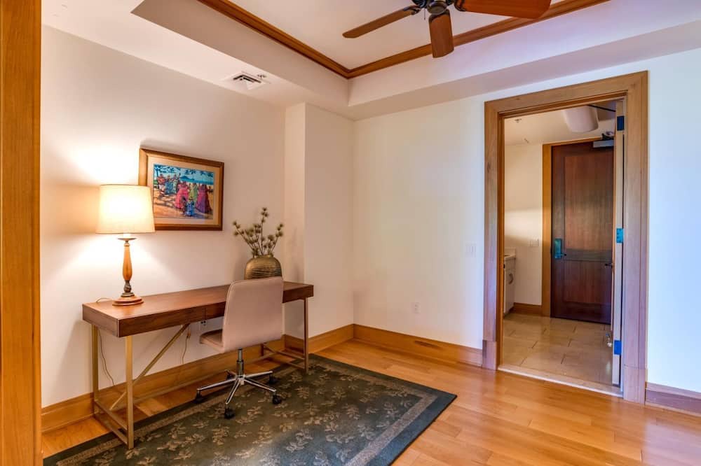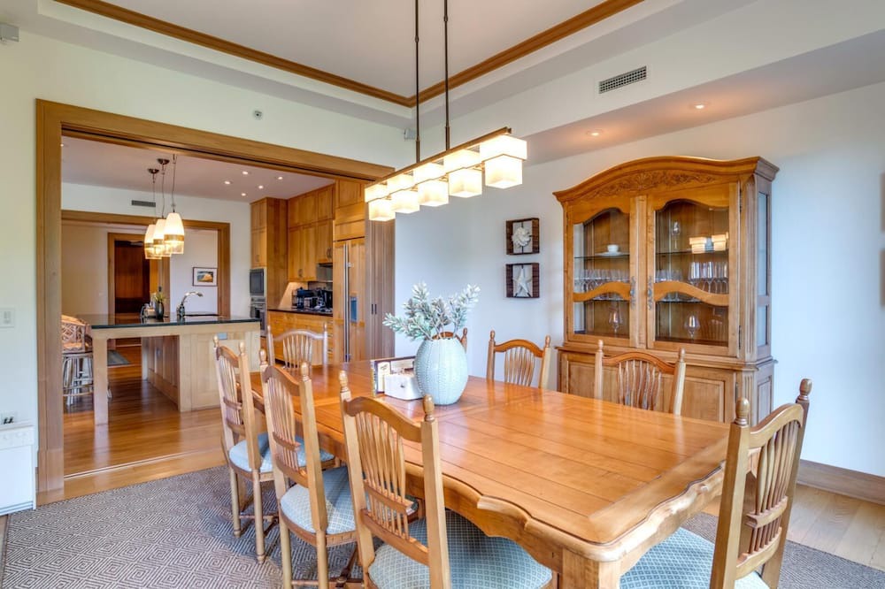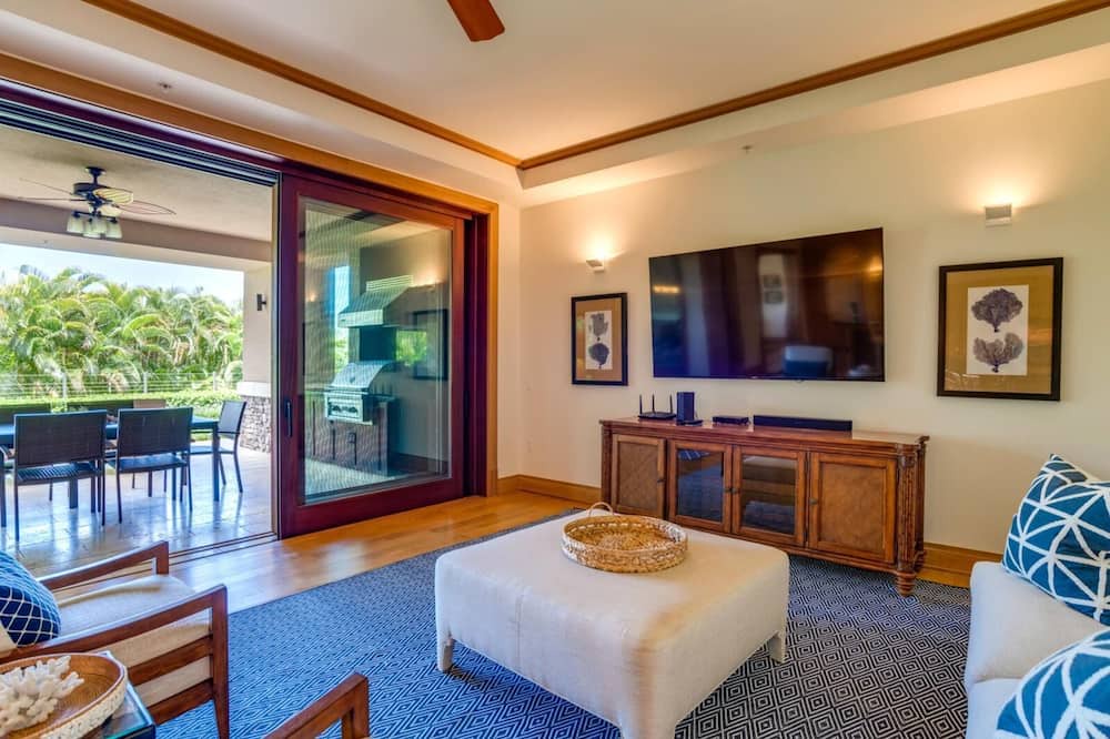 ** Please note, free night discounts are already included in the advertised rate and no additional deductions are necessary.** We invite you to the ultimate Maui vacation! Luxury awaits in this elegant villa with 3 bedrooms, 3.5 bathrooms with resort and partial ocean views. Every detail of this 2,900 sq. ft. retreat was carefully selected, and quality crafted creating the perfect vacation setting with you and your family in mind. Stepping into your private entry, you immediately notice the intricate details of modern sea accents, hardwood floors and trey ceilings. The open concept living area is greeted by an overflow of natural light streaming through the wall-to-wall Nano glass patio doors. The private, yet serene Lanai with its 1,200 sq. ft. of additional living space that opens out onto grass lawn and beach access down the stairs. This is the perfect place to dine and indulge in a fresh squeezed Island Mai Tai. With spacious seating for up to eight, enjoy the Hawaiian vegetation of Plumeria and Hibiscus landscaped throughout. The outdoor grill is the perfect set up to cook for the family. Breathe in the salty air and watch the blue waves roll in while relaxing after a long day on the beach boogie boarding and building sandcastles. The lush greens mixed with the awe-inspiring ocean, makes this Lanai the perfect retreat! The living room is an entertainer's delight, with a fully furnished living space, flat screen television, complimentary WIFI for streaming, HDMI ready, and the furniture layout that is perfect for conversations or the kids to play board games, with seating comfortably up to eight. This villa is kid friendly with an option of a Pac n' Play doubling as a crib, booster seating, plastic cups and beach toys! The custom Chef's kitchen has everything you need and more! Create your masterful meals on the stainless steel Viking range as well as all Viking appliances. Awaken your senses as you enjoy freshly squeezed juice, coffee and Eggs Benedict at the large granite breakfast bar. The gorgeous dining room complements the kitchen with a large dining table with seating up to 6 and access to the Lanai. The master suite is its' own oasis, with its' hand painted art pieces and modern Hawaiian Luxury decor. Naturally wake from a restful nights sleep with light trickling in on the luxurious king size bed. Enjoy your morning coffee on the separate yet private Lanai just steps from your room. Reflect and revitalize in the tub and granite shower with multiple shower heads. Treat yourself to the luxurious assortment of L'Occitane bath and body products, found in spas worldwide. The second guest bedroom is complete with bright garden paradise vegetation views, modern Hawaiian accents with bamboo artwork, lavender pressed sheets, king size bed, and flat screen television for your guests or family to enjoy. The third guest bedroom is similar to the second with its' own personal bathroom, paradise vegetation views, modern Hawaiian accents, and flat screen television. This room is equipped with two full beds making this suite a perfect set up for your kids! Hairdryer, facial mirror, and fresh towels available in each suite. Your family and guests will surely feel relaxed and at home! This remarkable property can sleep up to eight guests with an additional sleeper sofa in the den. Although we offer premium towel and maid services, this unit is equipped with a full size washer and dryer for any of your home away from home needs. Enjoy everything that the 'Malia' at The Montage of Kapalua Bay has to offer!