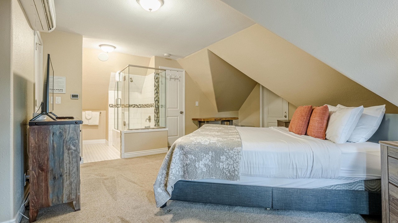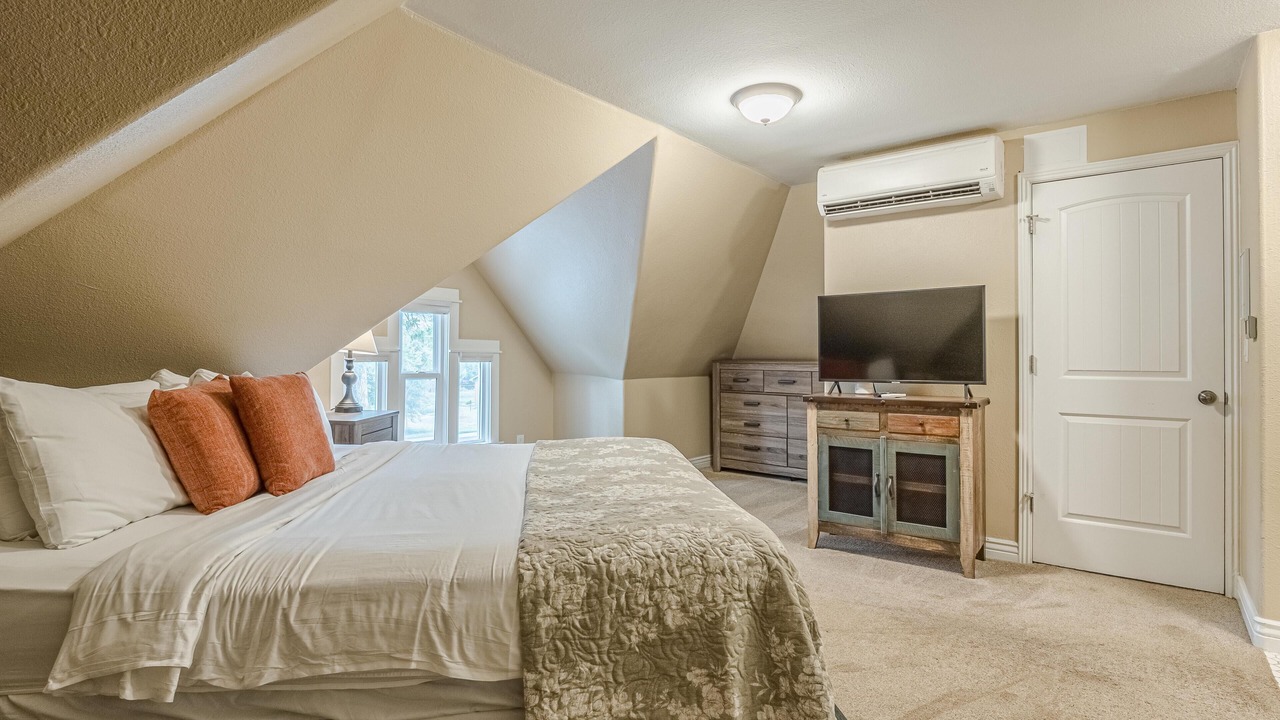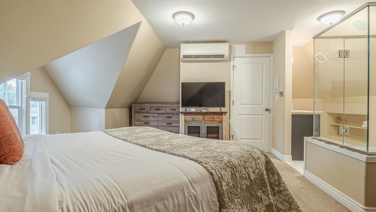 + The master bedroom, located on the second floor, has a king bed, a TV, closet storage, and a full ensuite bathroom! It includes a toilet, sink, and a step-in shower.