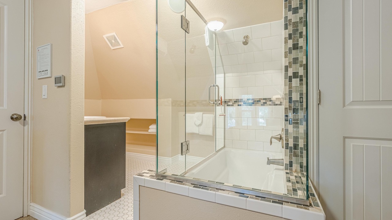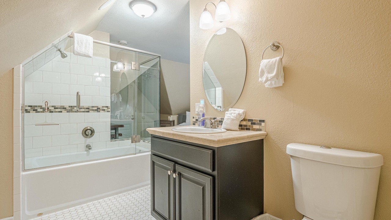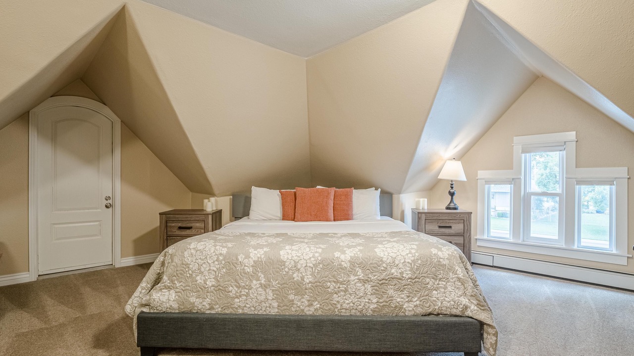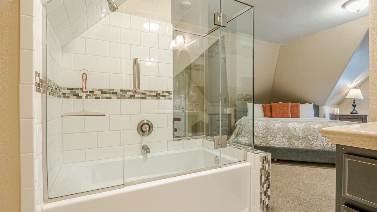 + The master bedroom, located on the second floor, has a king bed, a TV, closet storage, and a full ensuite bathroom! It includes a toilet, sink, and a step-in shower.