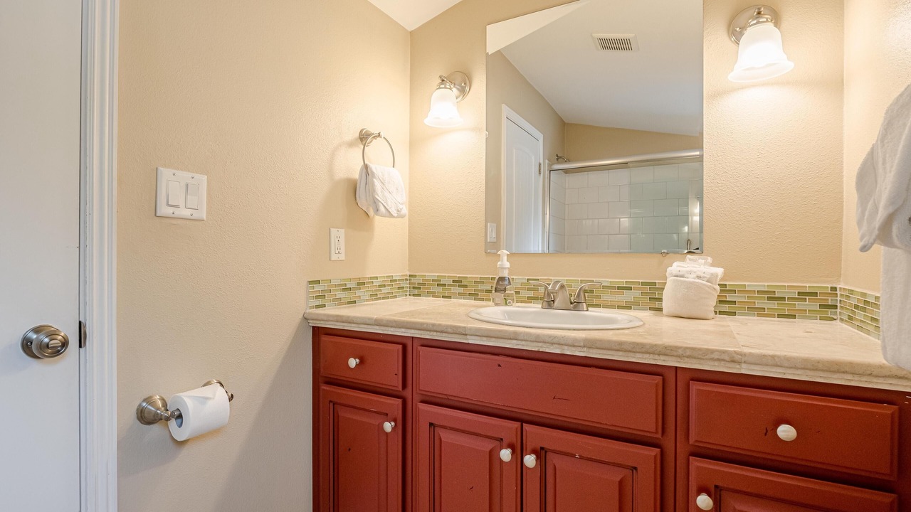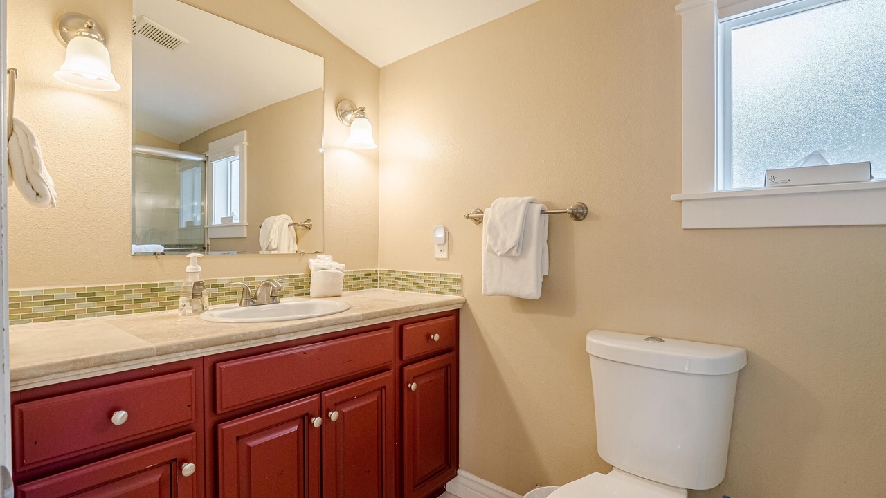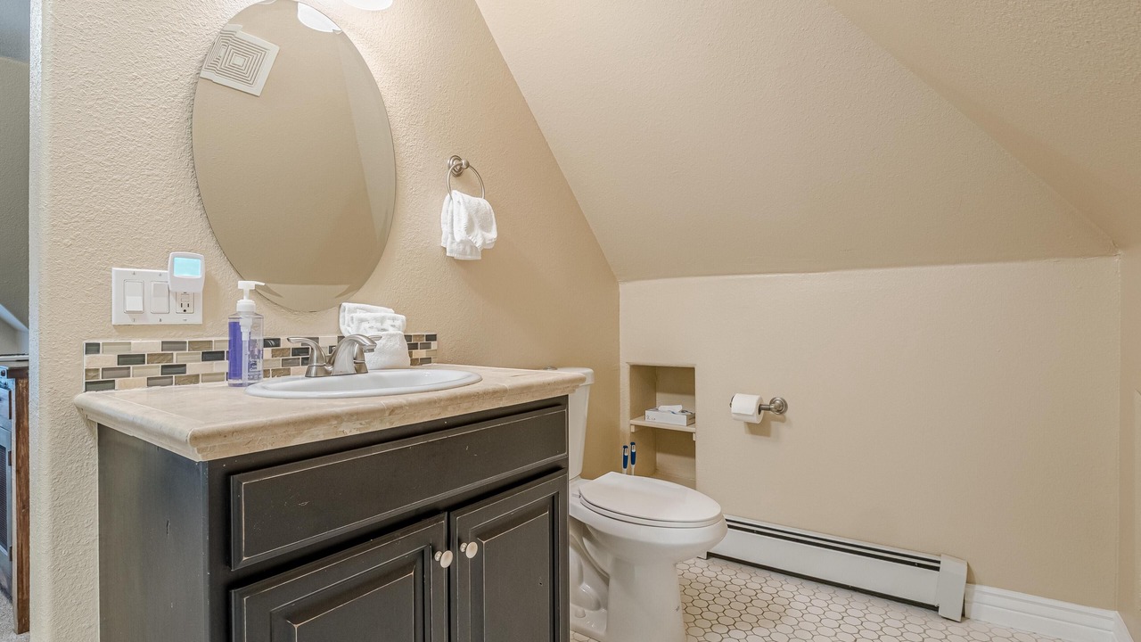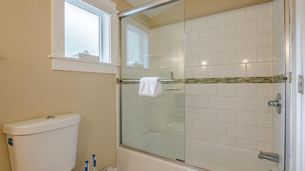 + The shared bathroom, located on the main floor, has a toilet, sink, and a shower/tub combo.