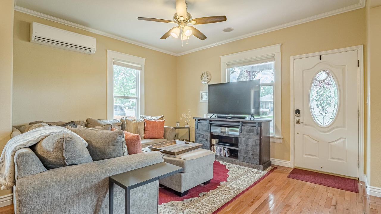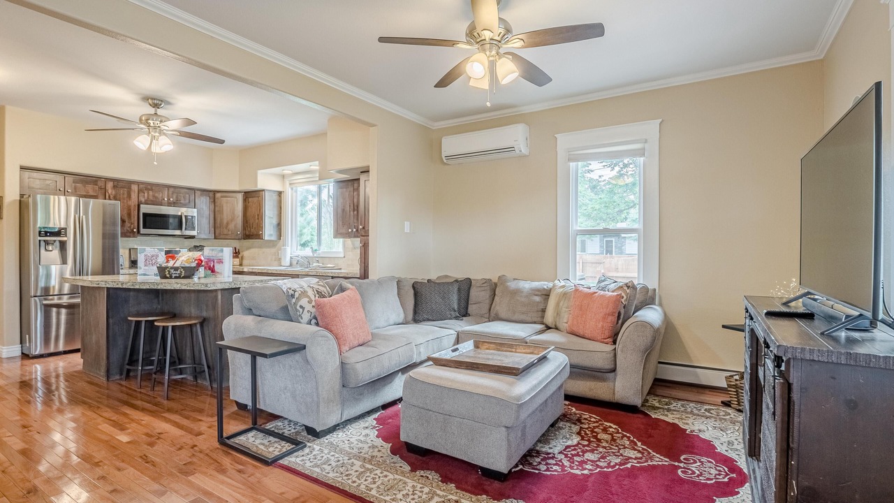 + Cozy Living Space: Relax in our bright and cheerful living room, featuring two comfy, deep-cushioned couches and a 65" smart TV with Wi-Fi for your entertainment needs.