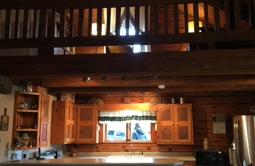 Hidden on 12 acres in the heart of Mohican Country, this beautiful log home is the perfect getaway for those who are looking to relax in the country and visit Mohican Park, Malabar Farm, Amish Country or Snow Trails Ski Resort. With 12 acres, you'll find peace and quiet as well as plenty of room to run. The large stock pond offers a pedal boat as well as easy fishing with no license required! The cabin itself has over 2000 sq ft of finished living area (not counting an unfinished basement) with 5 private bedrooms with queen beds, 3 baths, a huge great room with a magnificent floor to ceiling stone fireplace and 60" flatscreen TV, a fully equipped kitchen, dining area, loft area and game room in the basement with pool table and bar. There are two sofas in the living room. There is a daybed with trundle in the loft (we count as the 6th bedroom). A queen bed and twin over twin bunk bed are also in the basement bedroom. There is a pool table and a bar also in the basement. The 40ft front porch has swings and rockers and offers beautiful views of the property, pond and rolling country hills. Looking for a great place for an outdoor wedding, family reunion or other party? The lodge offers acres of green area around the pond that is perfect for tents and tables. Plus long driveway with a turn-around and a hayfield allows plenty of parkingWifi is available and there is also a generator in case of power outages. Best of all, the cabin is located within 10 miles Malabar Farm, Mohican State Park, Local Canoe Liveries, Prairie Peddler and Pleasant Hill Lake.