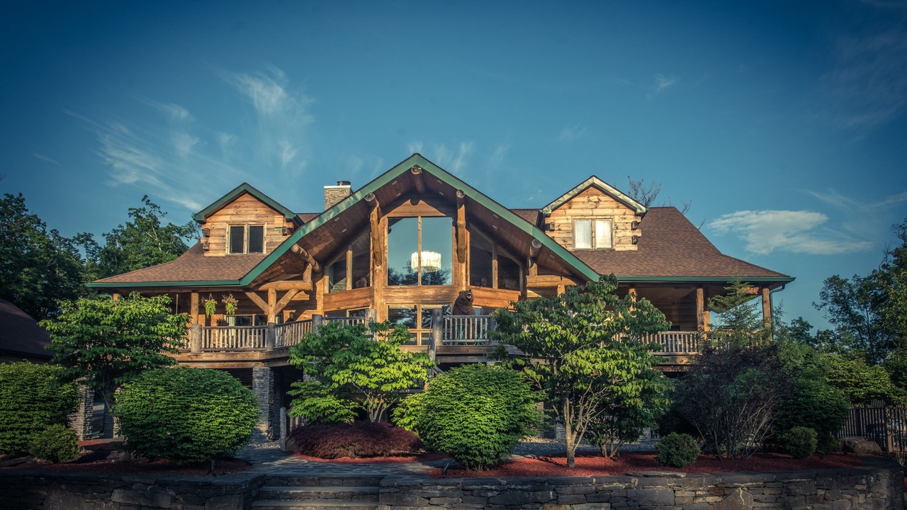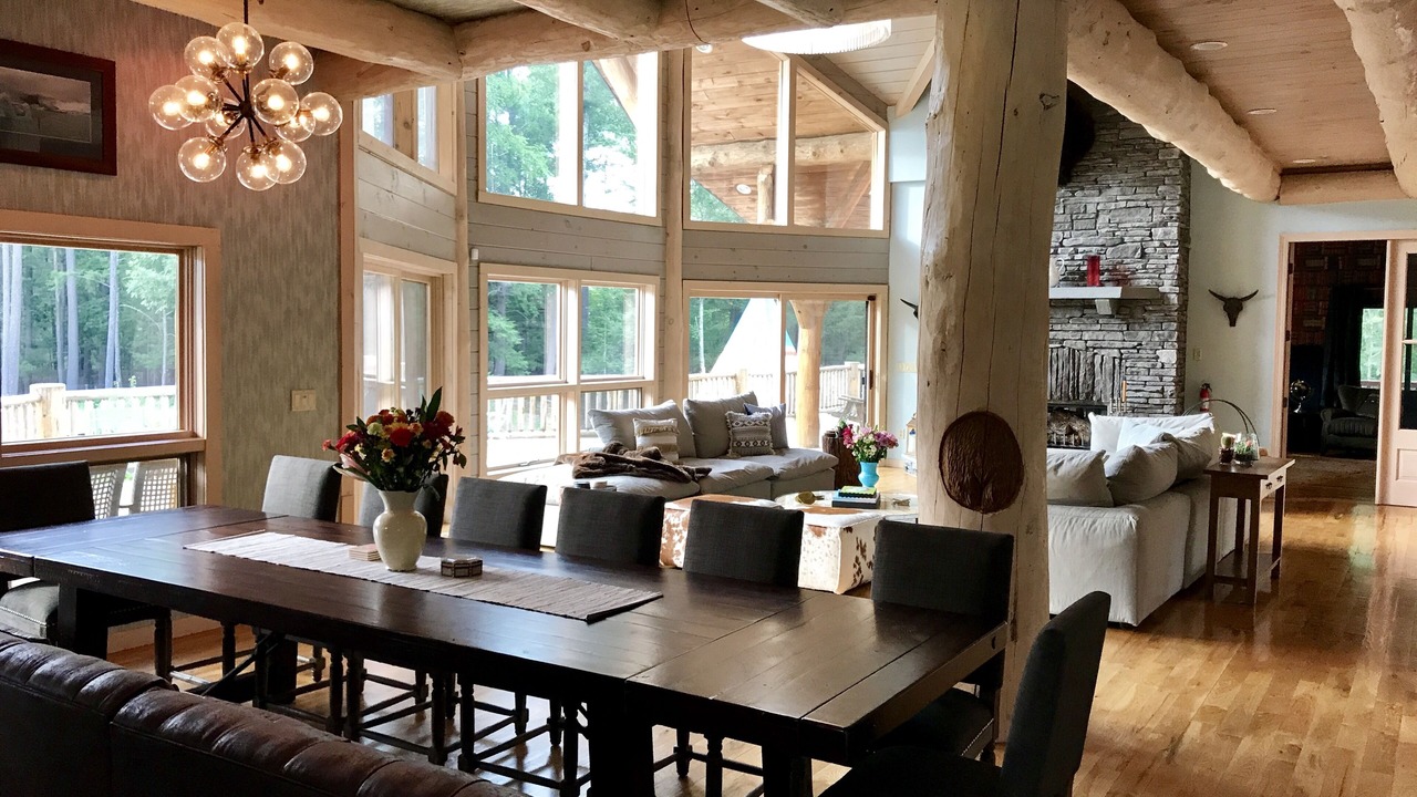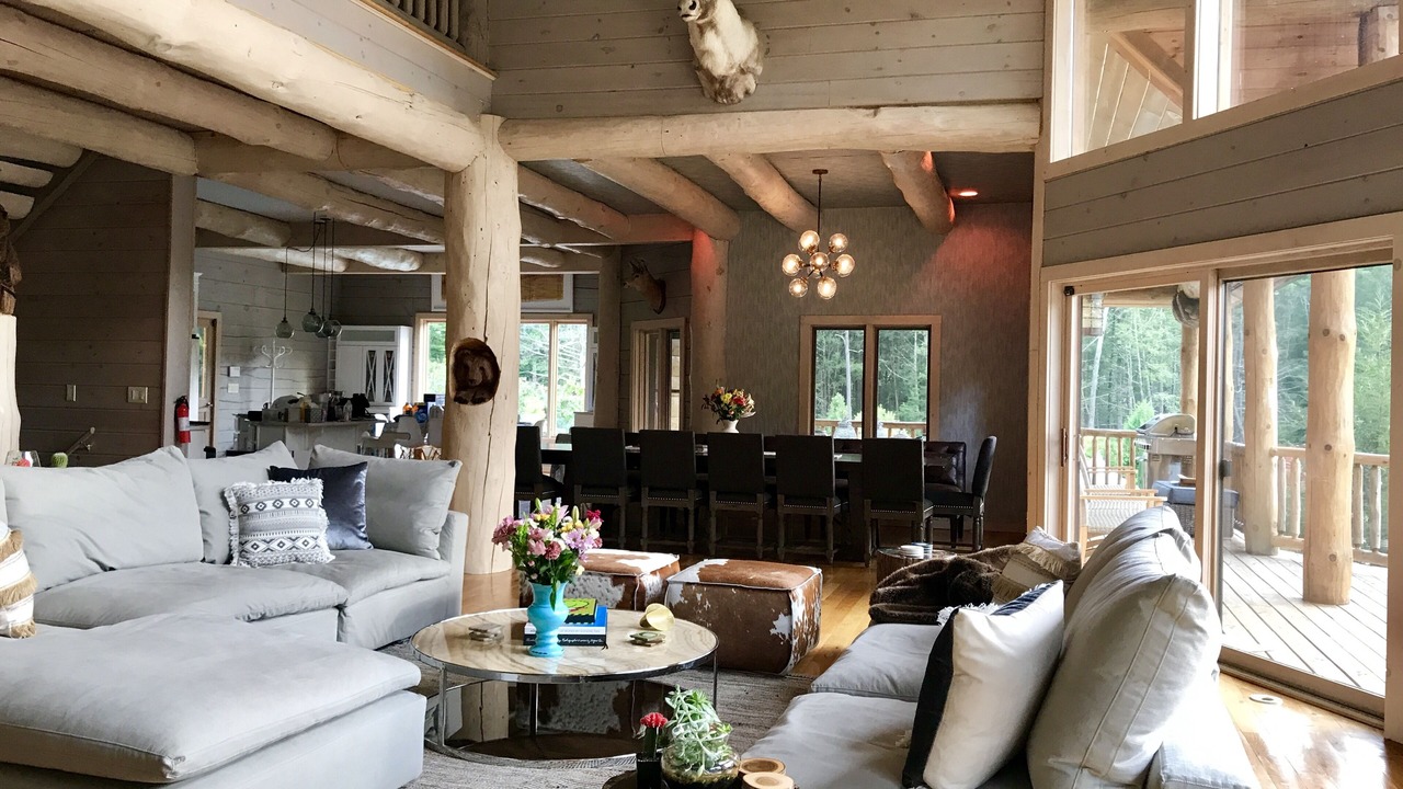 Expansive deck overlooks the grounds of our over 6000+ square foot luxurious 5 bedroom and 4 bathroom contemporary log cabin, renovated extensively throughout and suitable to sleep 10 guests.