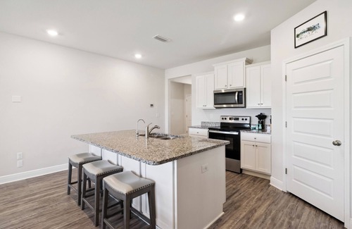 As you venture down the hall you will find the gorgeous open concept living/kitchen/dining area with a smart tv and access to the covered porch and backyard. The kitchen is fully stocked with all the essentials for a home-cooked meal. This modern kitchen offers granite countertops, a large island with seating for 3, stainless steel appliances, an electric cookstove, and tons of cabinet space. The dining area provides seating for 8 people. The master bedroom is conveniently located just off of the living room and offers a comfortable king-size bed and smart tv. The en-suite bath offers a walk-in shower and double vanity with granite countertops.