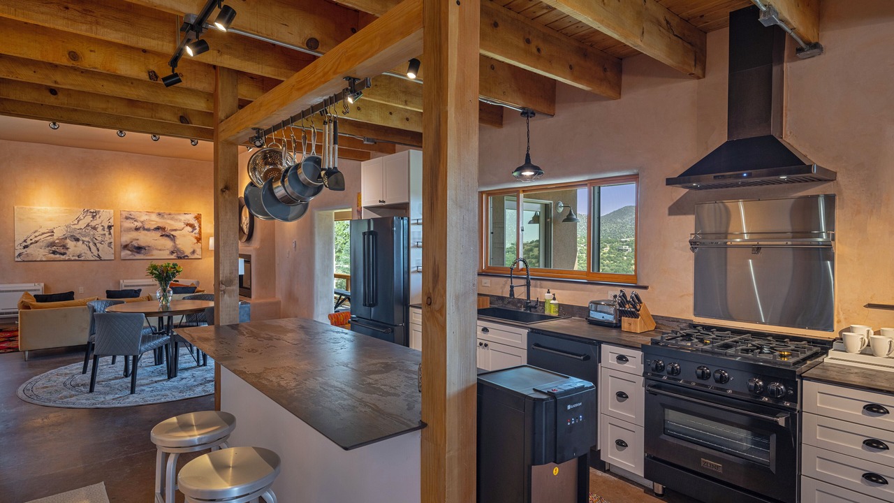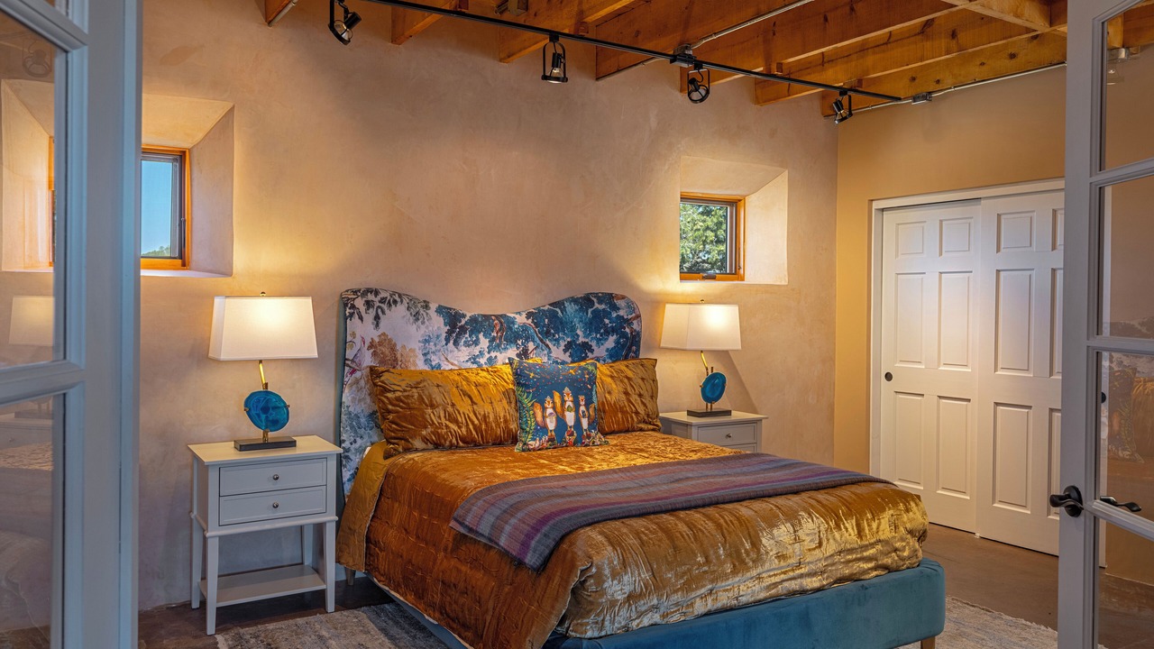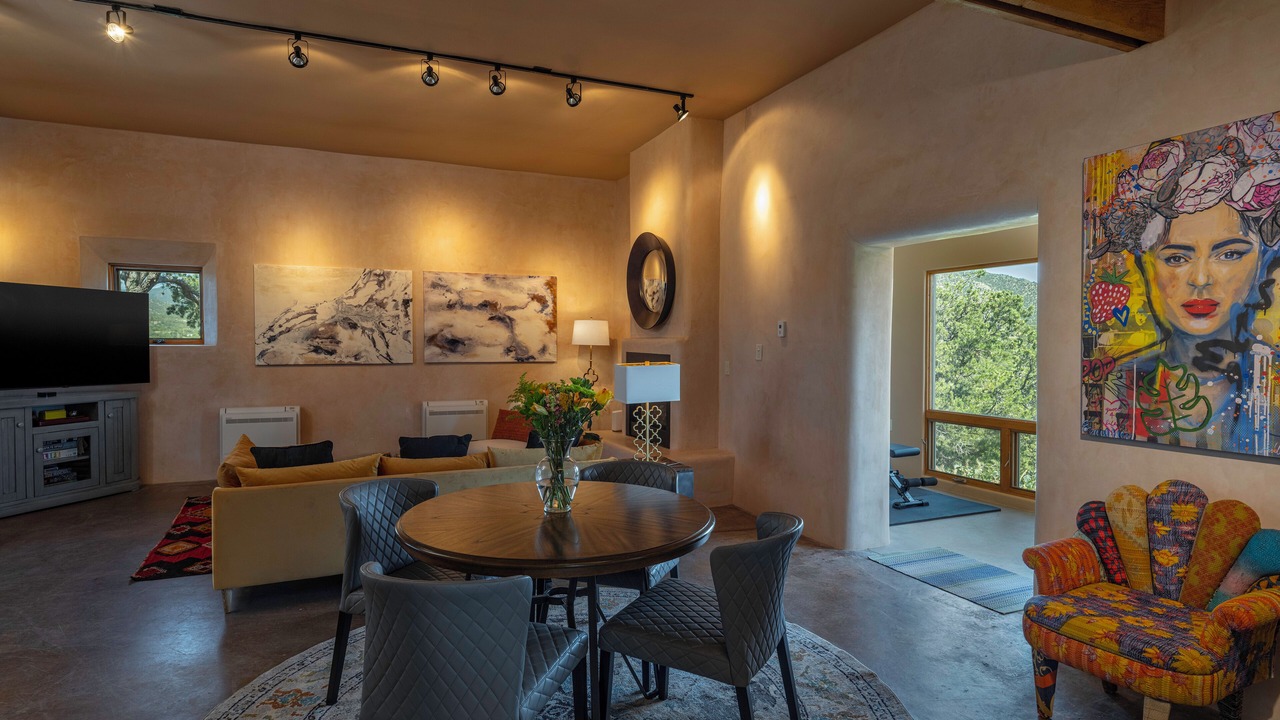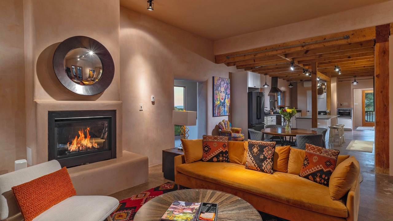 Architectural features of this spacious, one bedroom include a living area designed for relaxation, with diamond plaster walls, accent lighting, comfortable seating, and tasteful decor. Also features a remodeled bath with walk in shower and therapeutic walk-in tub, new AC mini split units, new hot water on demand and new washer and dryer. Includes Hi-Speed internet, 4K large screen televisions with all channels and Apple TV. Two parking spaces available. After a day of exploring Santa Fe, take in the breathtaking views of the rolling hills and serene landscape from your private porch overlooking the pollinator garden.