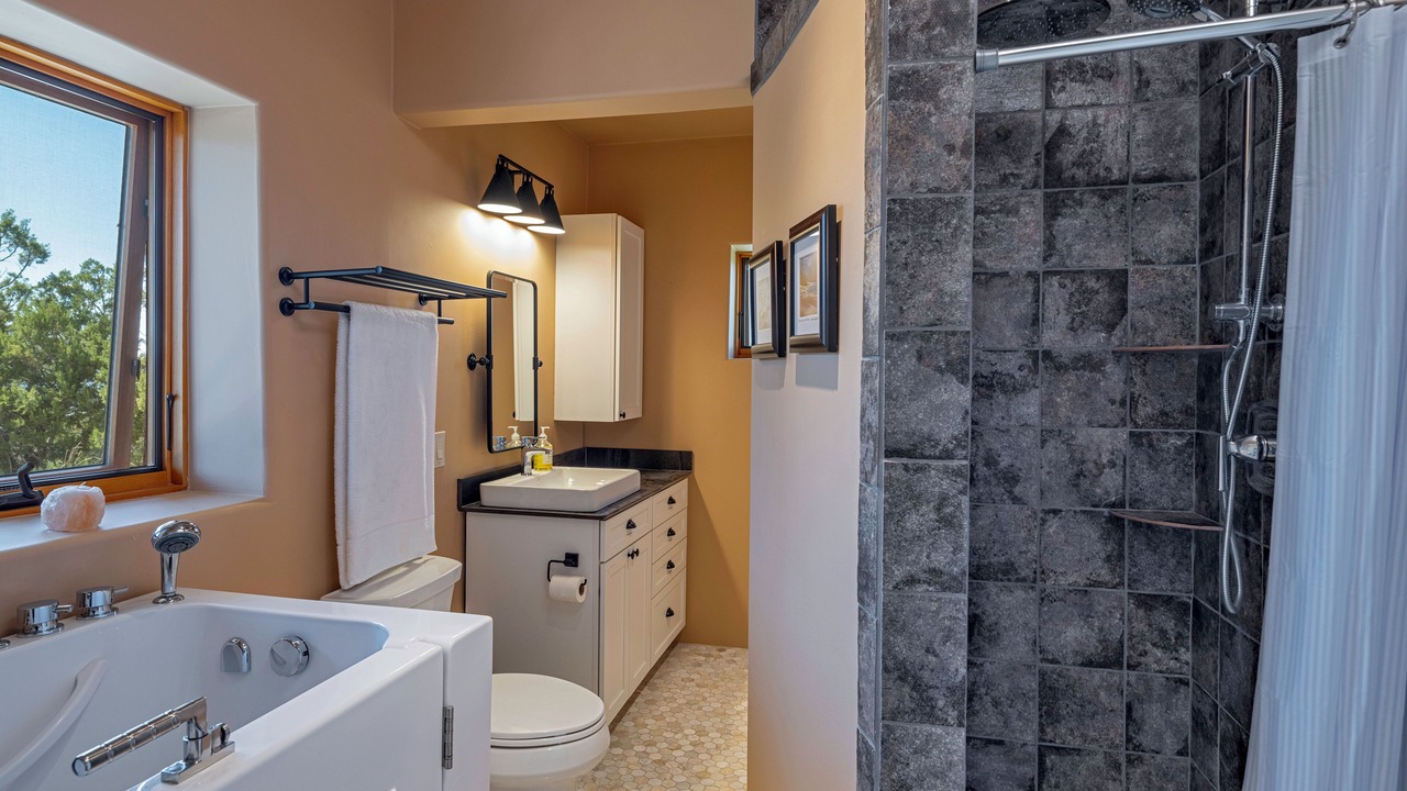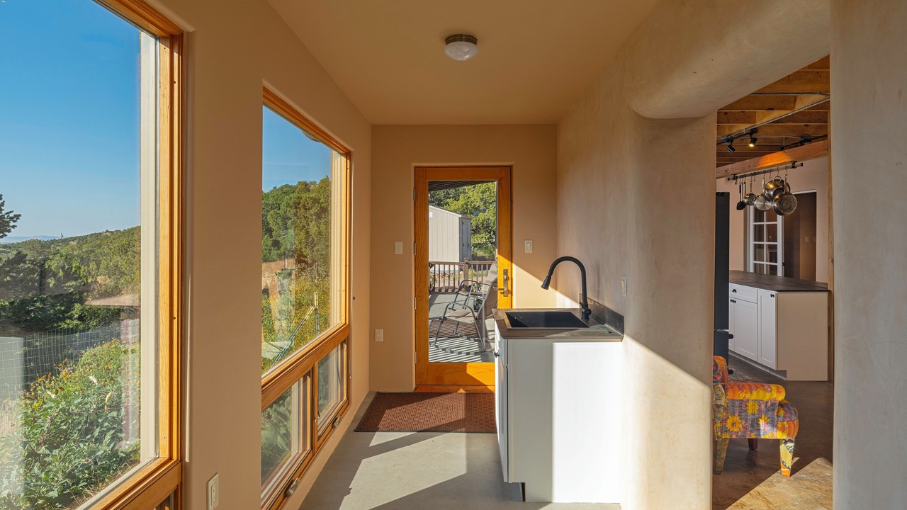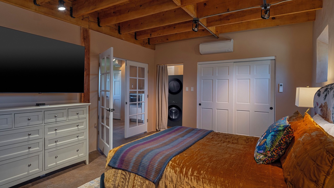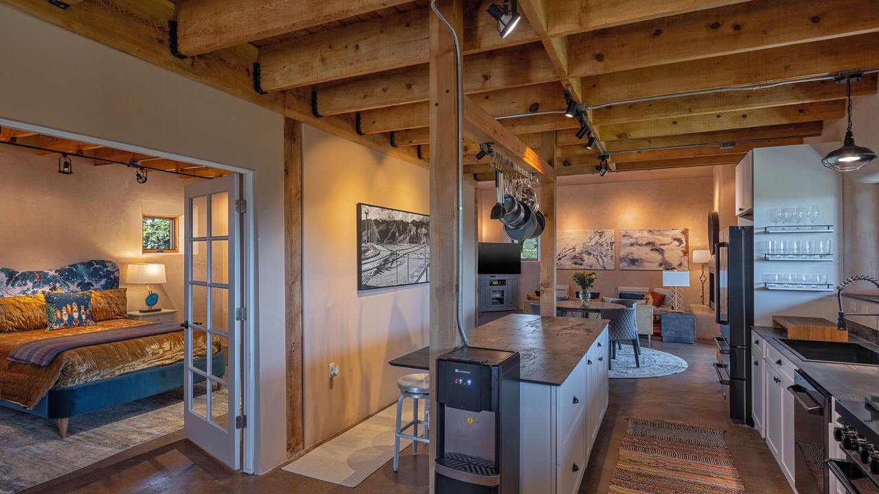 Architectural features of this spacious, one bedroom include a living area designed for relaxation, with diamond plaster walls, accent lighting, comfortable seating, and tasteful decor. Also features a remodeled bath with walk in shower and therapeutic walk-in tub, new AC mini split units, new hot water on demand and new washer and dryer. Includes Hi-Speed internet, 4K large screen televisions with all channels and Apple TV. Two parking spaces available. After a day of exploring Santa Fe, take in the breathtaking views of the rolling hills and serene landscape from your private porch overlooking the pollinator garden.