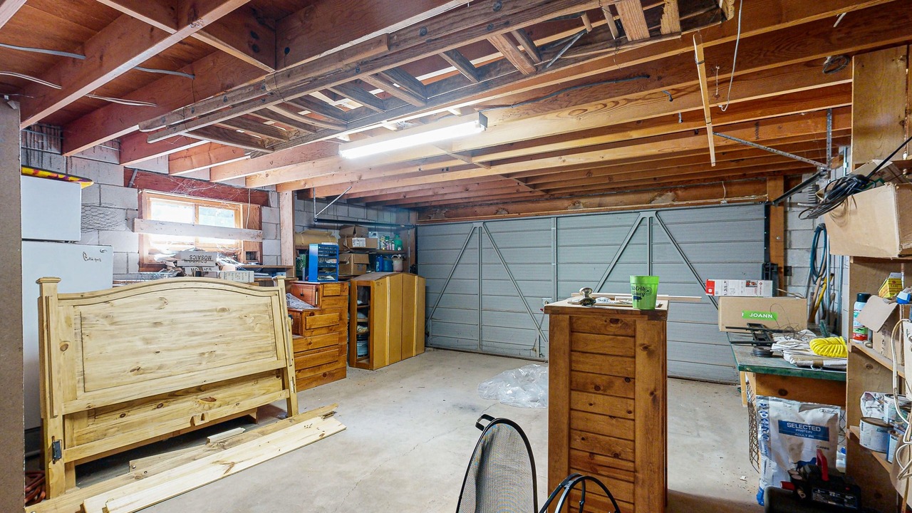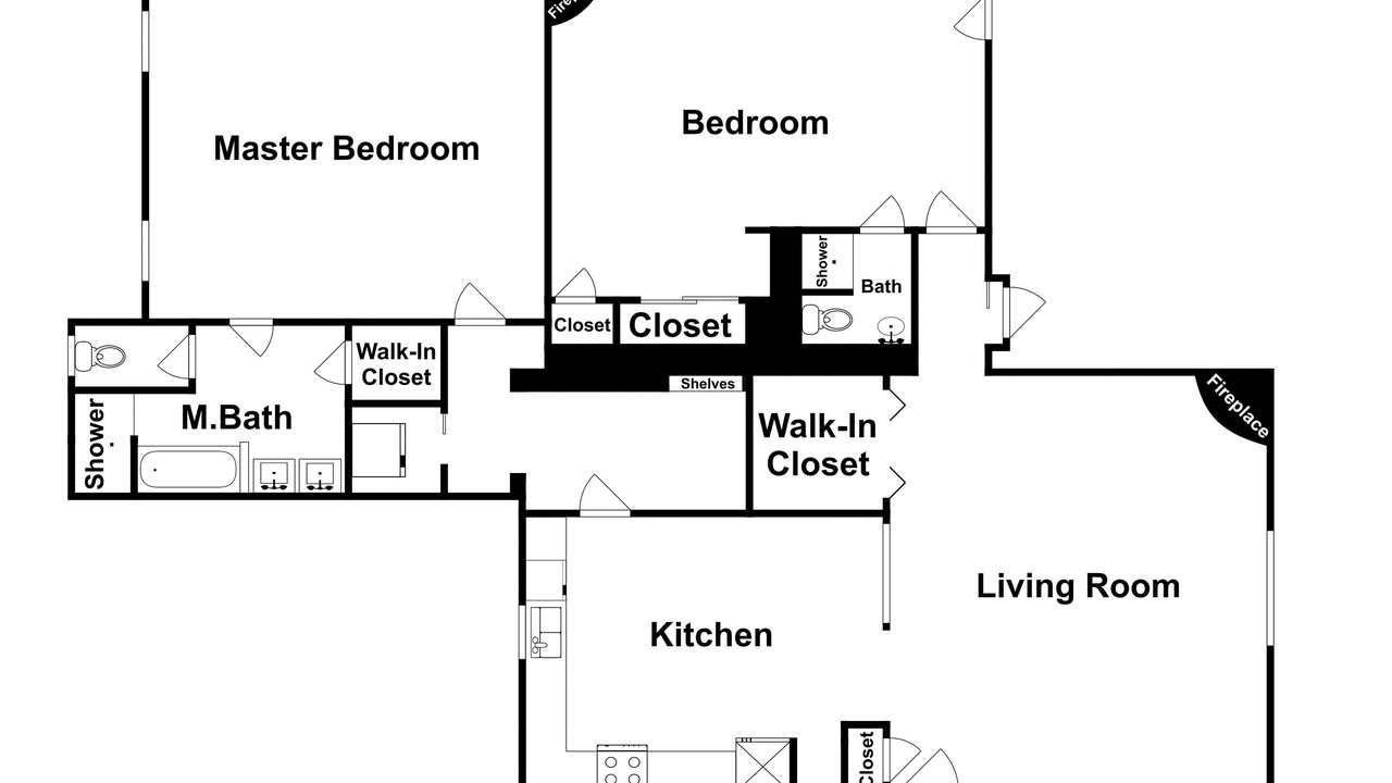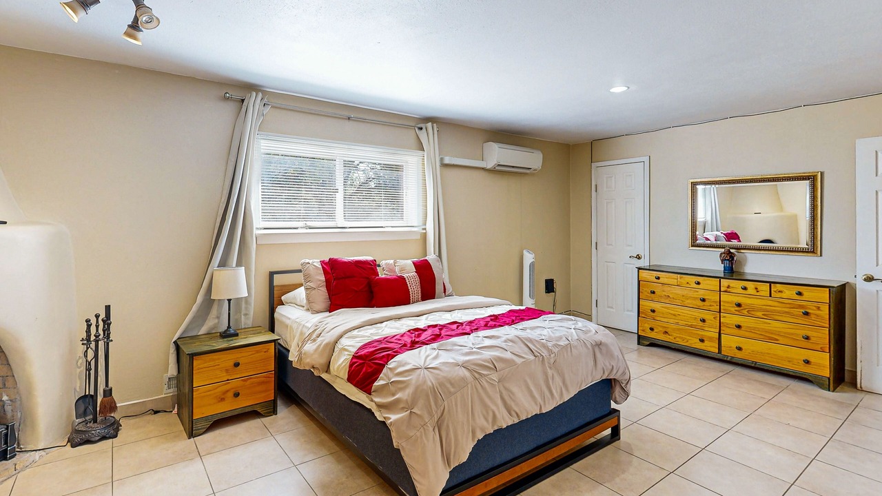 Sleep soundly in the guest bedroom, featuring a queen bed, twin bed, and wood-burning fireplace. The en-suite bathroom is configured with a walk-in shower.