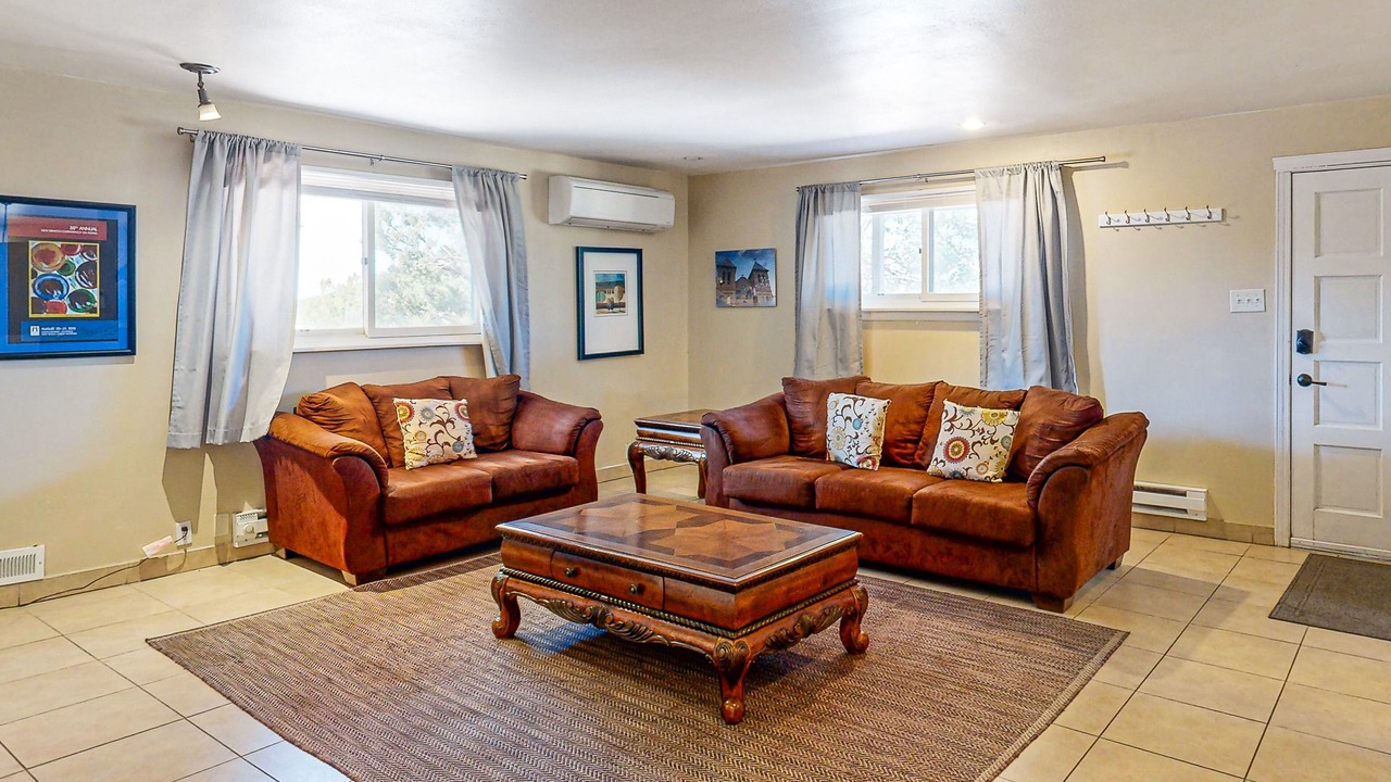 Find comfort in the master suite, complete with a plush queen bed, a twin-size bed, and a sleek en-suite bathroom with a walk-in closet, double vanity, soaking tub, and walk-in shower.