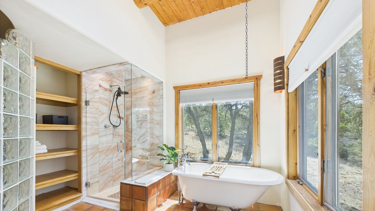The spacious master suite is a true sanctuary, featuring a private spa-inspired bathroom with a luxurious clawfoot bathtub, a glass-enclosed shower, and serene views of the surrounding landscape. Two additional bedrooms provide cozy accommodations for guests or family.