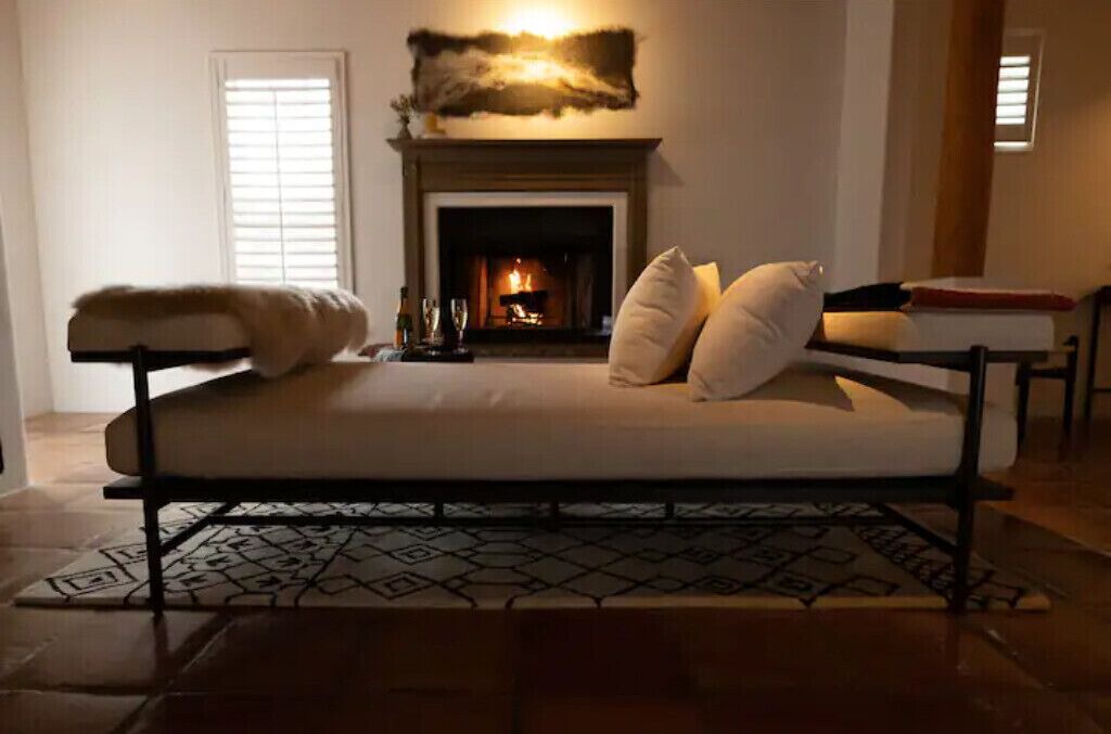 The Black Mesa is one of our largest suites, 560 sqft and includes a kiva wood burning fireplace, a large bath area with spa tub and shower above the tub. Your room includes an outdoor private patio area for a table and two chairs.