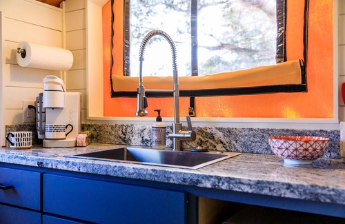 - Kitchenette with microwave, sink, small refrigerator/freezer, griddle & Keurig (no stove/oven)