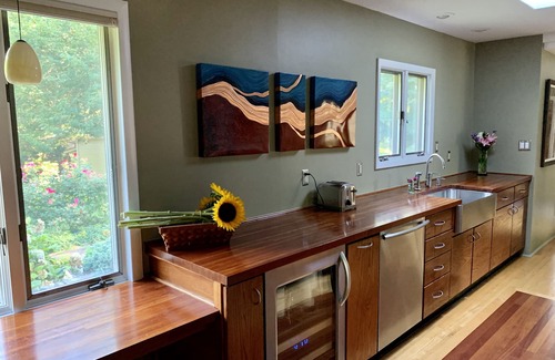 Custom home with inlaid floor, wood counters, hand made cabinets, and artistic touches. Beautifully landscaped large private yard. Badminton net and croquet available. Enjoy the outdoors bug free in the large screened-in porch while listening to the sounds of falling water and bullfrogs from the koi pond. Master king suite with vaulted ceiling, private patio with fire pit, and large walk-in shower. 52” tv in main room with video and music library in basement. Kitchen is well appointed with almost any small kitchen appliance (toaster, coffee maker, keurig, blender, crockpot, and more) you may need during your stay. Pour a glass of wine in the premium bar ware while storing your new wine finds from local Maryland wineries in the wine fridge in the kitchen. High quality pots and pans are available to whip up dinner to enjoy on the porch or in the dining room overlooking the pond.