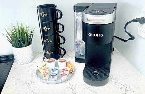 The kitchen has stainless steel appliances including an electric stove. There is a Keurig with a starter set of K-cups, full-size coffee pot, 4-slice toaster, Ninja blender, waffle maker, pizza pan, pots/pans, electric griddle, muffin tin, cake pan, and cookie sheets.